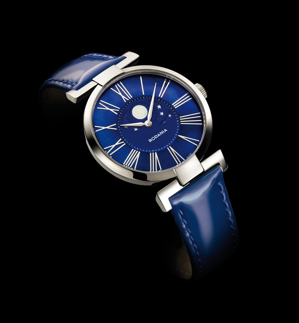 With its new Tyara Moon watch, Rodania offers its very personal portrayal of time imbued with a blend of poetry and elegance. A starry sky stands out against the mother-of-pearl dial, further graced by generous Roman numerals. The pure lines of this watch embody a subtle harmony between the classicism of traditional watchmaking and a more contemporary touch with a fashion twist. This charming and seductive model will become the faithful companion of refined women looking for the perfect balance between modern living and eternal dreams.