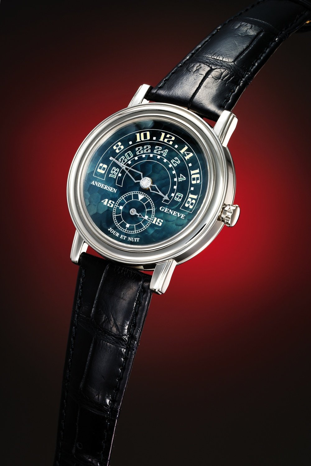 Andersen Genève returns to an exceptional watch, imagined in 2000, in response to demand from collectors and admirers of rare mechanisms that bring to life equally rare displays. For this new Grande Jour & Nuit, indications have been transferred, highly legibly, on the dial with daytime hours (6am to 6pm) and night-time hours (6pm to 6am), in addition to a small minutes dial. The long tip of the central hand points to daytime hours while the shorter end indicates night-time hours. It jumps when the small minute hand has made one complete revolution of the dial.