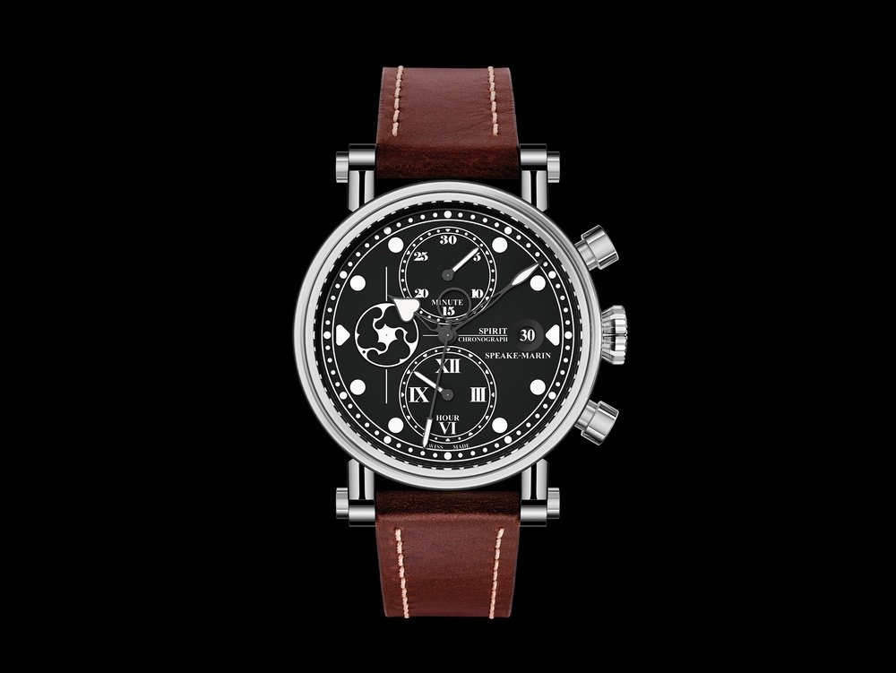Having made minute repeaters, perpetual calendars, tourbillons and other horological sleights of hand, the most British of Swiss watchmakers presents his first chronograph, Spirit Seafire, a name inspired by another first: the Supermarine Seafire which was the British Royal Navy’s first carrier-based airplane. Remarkably distinctive, this masterful composition is set in a new Piccadilly case in titanium. Superbly staged against a mat black dial, the three-dimensional indications feature white Super-LumiNova applications which glow green in the dark for excellent legibility. Roman numerals on the hour counter at 6 o’clock are a rarely-seen detail. Small seconds at 9 o’clock take the form of Speake-Marin’s signature “topping tool” logo.