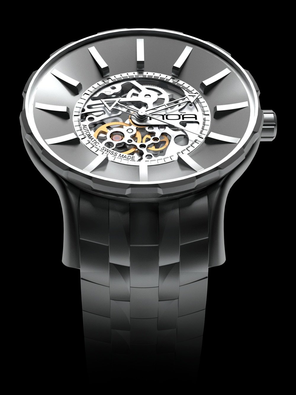 N.O.A. exposes the mechanics of time by revealing the beating heart of its latest creation, Skell. This automatic calibre with its highly architectural skeleton-working features colourful elements that further highlight the three-dimensional N.O.A signature. A wealth of subtle depth and transparency effects ensure that nothing is hidden and that each second becomes truly unique.