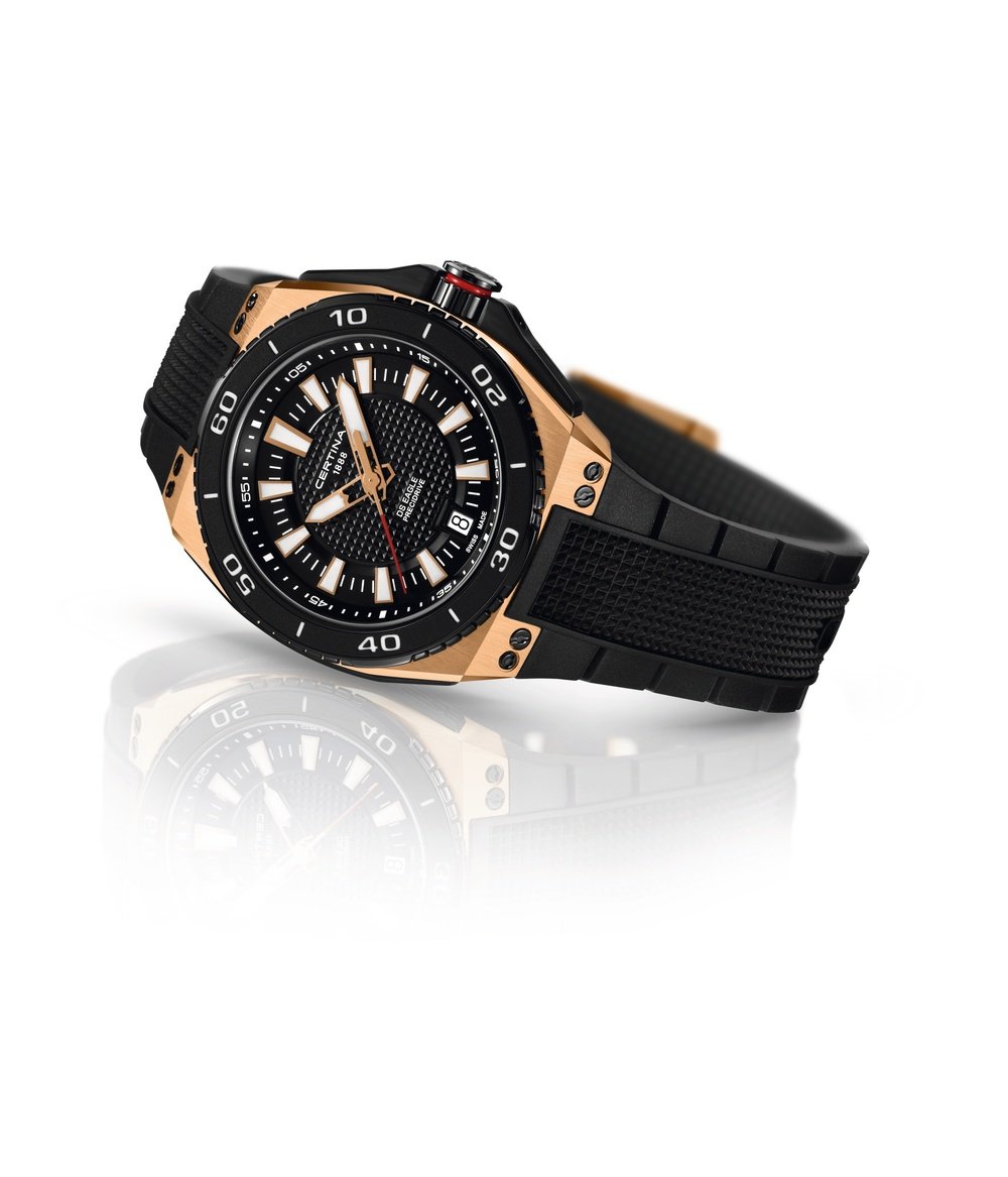 Inspired by extreme sports, the new DS Eagle offers a powerful blend of remarkable precision with its ETA quartz Precidrive movement, featuring an uncompromisingly virile design style. The black rubber-clad bezel frames a broad dial with a textured surface confirming the geometrical lines of a pink gold PVD-plated case. The impressively high-performing DS Eagle features exceptional readability thanks to generous luminescent hands and hour-markers, while the watch as a whole is water-resistant to a pressure of 20 bar (200 metres).