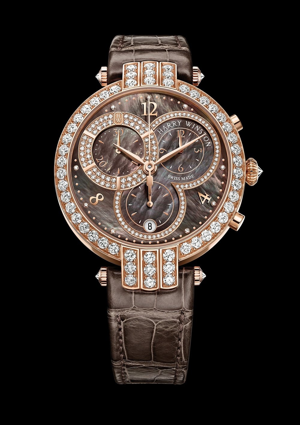 Mr Harry Winston loved women and set out to conquer the most extraordinary precious stones in their honour. In the same sparkling vein, the Premier Lady Chronograph is a combination of bejewelled extravagance and creative virtuosity. Derived from the first collection, launched in 1989, this timepiece features a slimmer case in pink gold with reworked attachments whose signature form alludes to the arches of Harry Winston’s flagship Salon on New York’s Fifth Avenue. Forging even stronger ties with the company’s heritage, generous diamonds, made all the more magnificent by a delicate setting, illuminate the wrist with their radiance and purity. The elegant Tahitian mother-of-pearl dial introduces a touch of brown with smoked accents. An exquisite crown brings the final, perfect detail that sets the seal on this timepiece’s jewellery legacy.