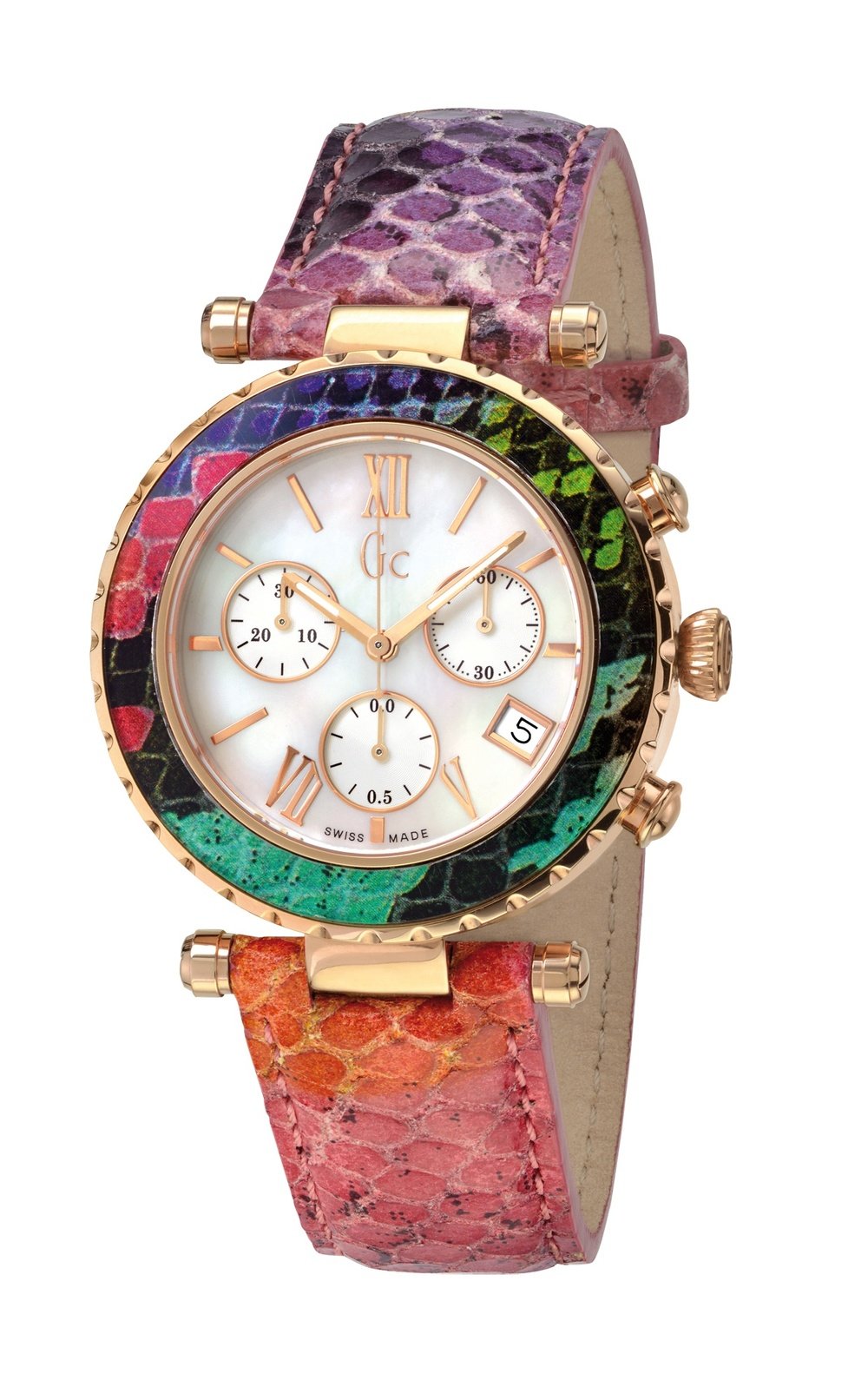 All the colours of the Brazilian rainforest come to life in this new Gc Rainbow Python. Fashion conscious women can dress their wrist in vibrant tropical shades with a sophisticated calfskin strap in a distinctive python pattern. For the dial, white mother-of-pearl lends a touch of iridescent softness while the rose gold PVD treatment of hour-markers and case brings a precious appearance to the whole.