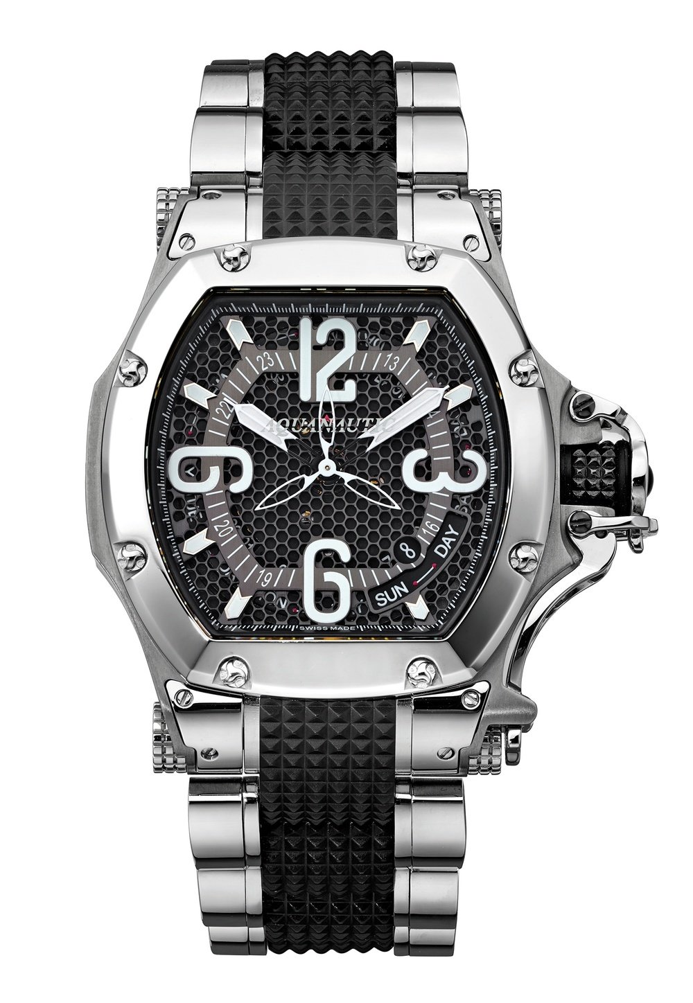 Epitomising the inimitable Aquanautic design, the Tonneau watch returns in a new and more stylish than ever variation. Its laser-sculpted dial features four luminescent Arabic numerals, while the day and date appearing through openings between 4 and 5 o’clock. The iconic propeller-shaped sweep-seconds hand serves as a reminder of the brand’s maritime origins. The powerful lines of the case are topped by a bezel that is interchangeable like the strap and gives the watch a variety of faces, while the sporty crown is protected by an ingenious patented safety clasp inspired by submarine hatches.