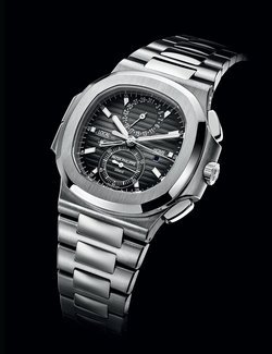 Patek Philippe presents its first timepiece to combine a dual time zone with a chronograph. These eminently useful functions are showcased together in the new Nautilus Travel Time Chronograph. Local time is set forwards or backwards in one-hour increments by means of two pushers. Their seamless integration into the side of the case at 9 o’clock conserves the iconic design of the Nautilus, launched in 1976 and inspired by the shape of a porthole. As for the chronograph pushers, they are positioned next to the crown. The dial is distinguished by a dual day/night indication, one for each time zone, a date hand at 12 o’clock, and a 60-minute totaliser at 6 o’clock, ensuring at-a-glance legibility. This original combination of six complications was made possible by the development of a new automatic movement which is visible through the sapphire crystal back.