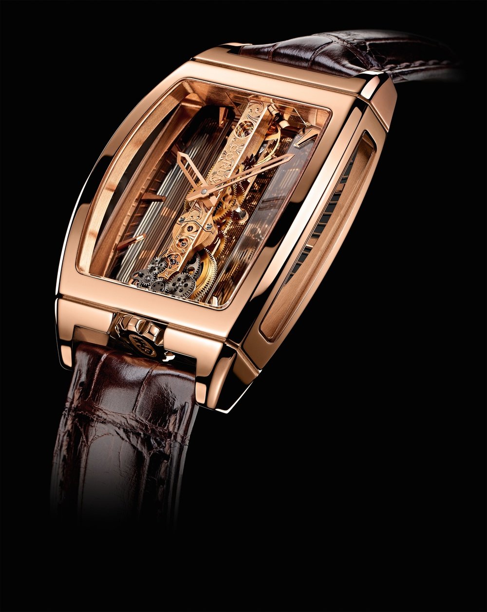 Developed in 1980, Corum’s baguette movement quickly made its mark as an icon in contemporary watchmaking thanks to its unconventional vertical construction. Corum masterfully rose to the challenge of transmitting energy in this linear movement. Staged inside a red gold case framed by four sapphire crystals for the front, back and sides, it invites an all-encompassing immersion into the magic of these linear mechanics, at the heart of a captivating play on transparency. The red gold upper bridge is adorned with hand engravings, as is the mainplate, thus embodying the finest watchmaking traditions.