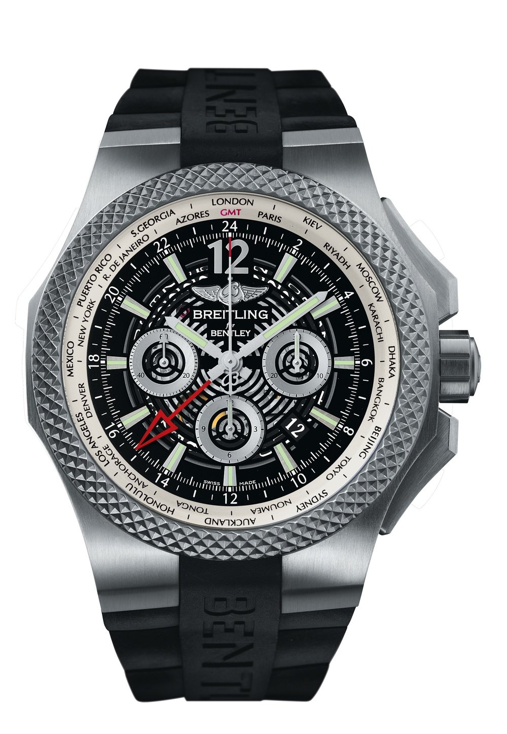 Bentley for the quintessence of British chic. GMT for the revolutionary crown-adjustable dual timezone system. Light Body for the featherweight titanium case. B04 for the COSC-certified Manufacture Breitling calibre. An authentic wrist-borne sculpture with an original design, this traveller’s chronograph offers unprecedented simplicity of use. When jumping between time zones, simply pull out the crown and turn it forwards or back in one-hour increments, leaving the minutes to go on tracking time with absolute precision. The date automatically adjusts to local time in both directions. For added comfort while “on the road”, the 24 world cities inscribed on the rotating inner bezel indicate at a glance every time zone in relation to the one shown by the 24-hour hand.>>> Mechanical automatic, Manufacture Breitling B04 COSC-certified chronometer calibre. Hours, minutes, seconds, chronograph, date, 24-hour second time zone.