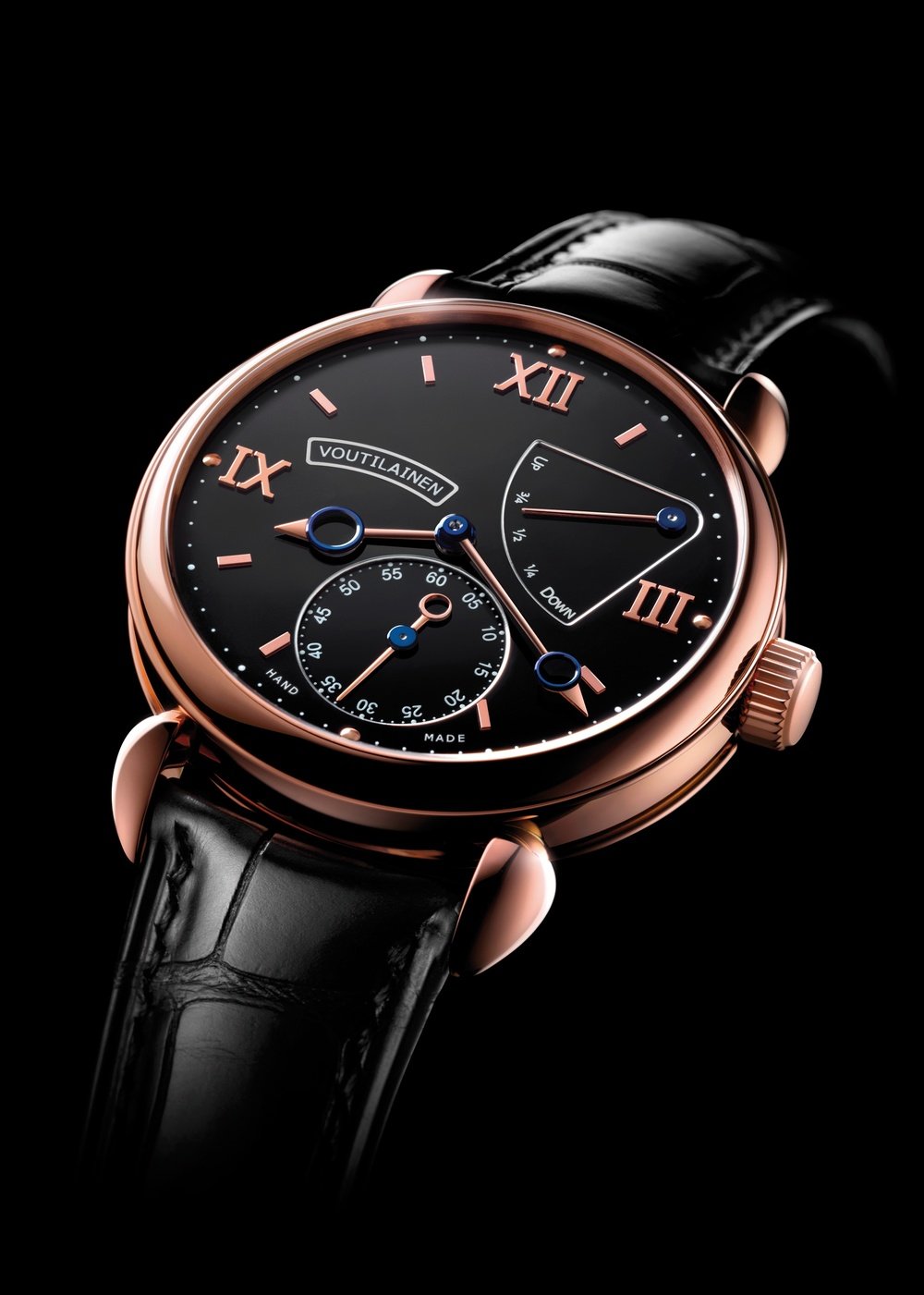 Winner of the Best Men’s Watch prize in the 2013 Geneva Watchmaking Grand Prix, the V-8R houses a wealth of mechanical feats entirely achieved by Voutilainen. Equipped with a direct-impulse two-wheel movement, it also features an original device serving to reveal the power-reserve mechanism. To limit the duration of the latter to the period when the mainspring torque is at its highest, Voutilainen has built it in the shape of a Maltese Cross on the barrel, thus adding over two days’ optimal power reserve out of the theoretical full 65 hours. 25-piece limited edition.