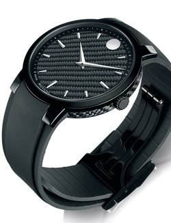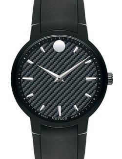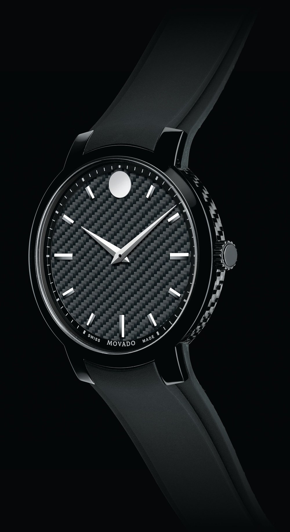 Movado explores a daring ultra-modern design with its latest model named Gravity. Elongated lugs accentuate the streamlined profile of the slender 8 mm case, while the carbon fibre ring adorning the case middle and PVD finish instil it with a resolutely high-tech aura of sophistication. The iconic Movado dot at 12 o’clock stands out with aesthetically pleasing clarity against the shiny black carbon dial, rimmed by a black minute circle and generous silver-toned hour-markers creating elegant contrasting effects. Modernity, design innovation: Movado’s characteristic triptych once again displays its impressive powers of seduction.>>> Quartz. Steel case with polished black PVD finish. 42 mm. Hours, minutes. Shiny black carbon fibre dial. Integrated black rubber strap, raised and subtly textured central part, smooth edges.