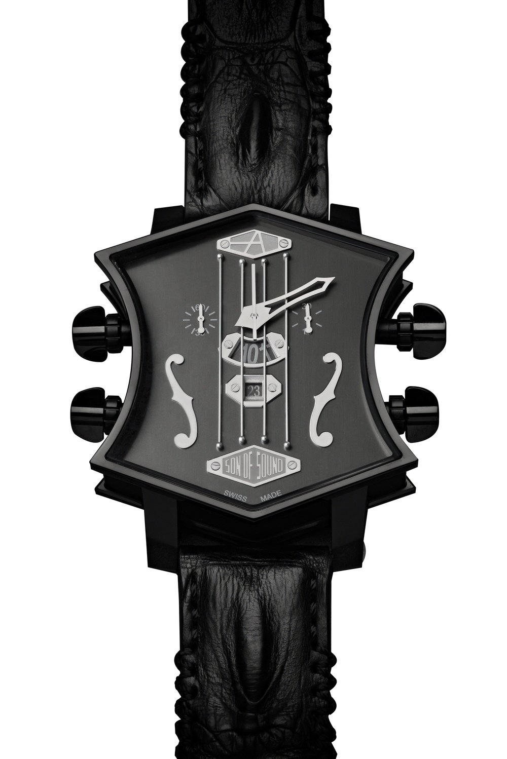 Infused with a powerful avant-garde spirit, ArtyA sends a rock-style breeze blowing across wrists. Black rock, like this Son of Sound with its revolutionary guitar-shaped case protected by seven patents. One might almost be tempted to forget that this riff-saturated revelation is also a high-precision chronograph. Its pushers are guitar pegs and its dial is composed of a set of strings and sound holes over counters and windows that remain eminently readable despite the dark overall tone. Black is Black certainly ‘sounds’ more expressive than ever. >>>Mechanical automatic movement, ArtyA-Woodstock by Concept calibre. Hours, minutes, seconds, chronograph, date. Black PVD-coated steel case. Crocodile leather strap.