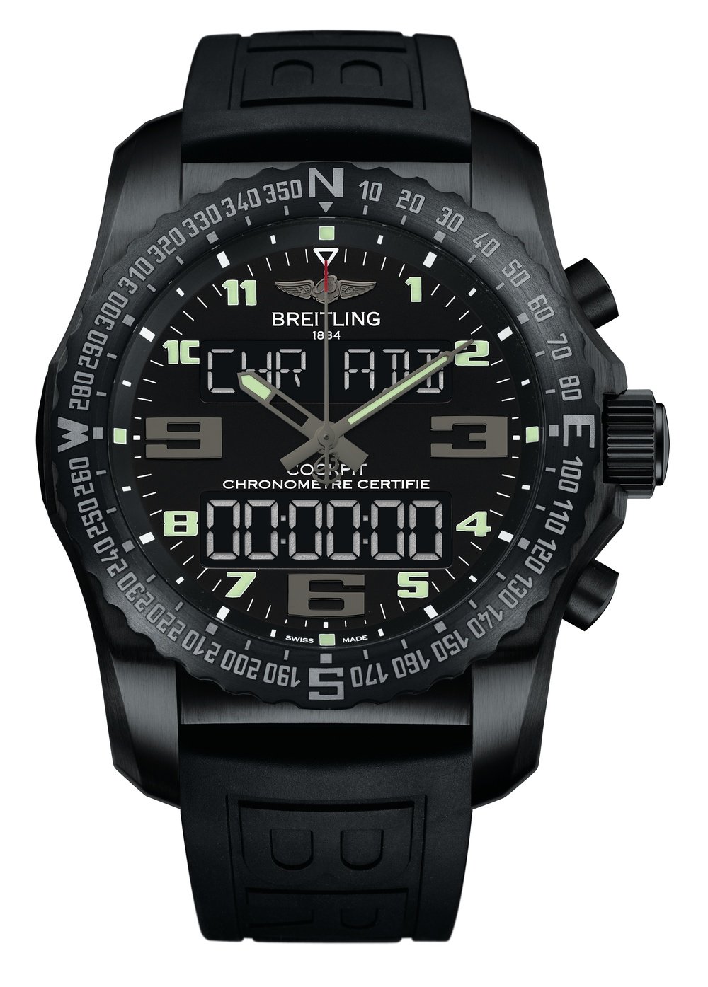 Introducing the ultimate instrument for pilots: the Cockpit B50 Night Mission. A powerful, masculine exterior conceals some truly amazing technology, beginning with the exclusive Breitling B50 calibre, a SuperQuartzTM movement that is ten times more accurate than standard quartz and has COSC chronometer certification. Designed for the toughest of missions, this chronograph’s innovative functions include an electronic tachymeter, a countdown/countup system that switches directly from countdown to timing, and a chrono flight function that records flight times by memorising take-off time, landing time and date. The Cockpit B50 uses Coordinated Universal Time (UTC), aviation’s reference time, as its base, making it easy to juggle time zones and even switch local time and second time zone displays thanks to the ingenious swap function.>>> Manufacture Breitling B50 COSC-certified chronometer calibre, thermo-compensated SuperQuartzTM. Black titanium case, 46 mm. Analogue and 12/24-hour LCD digital backlit display.