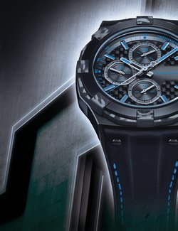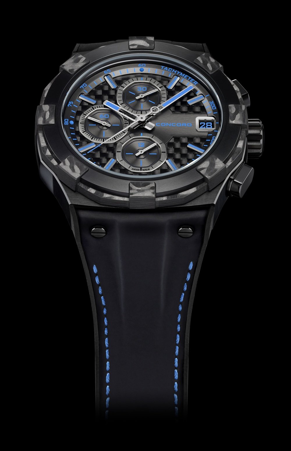 The iconic 21st century C1 Chronograph model by Concord is subtly reinvented while maintaining its original avant-garde spirit. Slimmer and more incisive as well as larger than its illustrious predecessors, it appears this year in a titanium livery that makes it almost as light as air. The historical rubber-moulded metal bezel of the C1 has been replaced by an ultra-resistant black carbon fibre version accentuating the extremely modern aesthetic of the watch. Against the backdrop of this composition on the theme of black, intense blue luminescent hands and hour-markers stand out distinctly, echoed by the topstitching on the rubberised calfskin strap. The exclusive niche occupied by the C1 Chronograph in the world of contemporary watchmaking is more well-deserved than ever.>>> Mechanical automatic, Calibre A07.211. Black PVD-coated grade 5 titanium case, 47 mm. Carbon fibre bezel, ceramic pushers. Hours, minutes, seconds, date, chronograph.