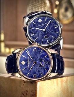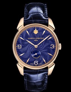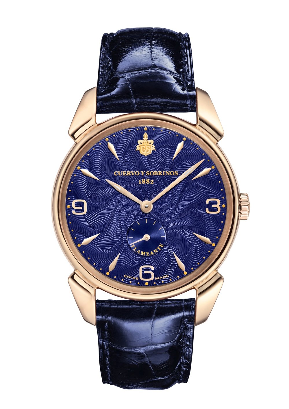 The Swiss brand with a Latin soul, Cuervo y Sobrinos returns to its rich past and revisits one of its extra-thin watches from the 1950s. The name of this symbol of impeccable style and elegance comes from the stunning guilloché on the dial, known as “flameante” for its unique flame effect which brings out the beauty of the magnificent indigo blue. A limited edition of 50 in pink gold, one for each of the American states, and of 132 for the steel version, a nod at the number of years since Cuervo y Sobrinos was founded.>>>Hand-wound mechanical movement, extra-thin ETA 7001 calibre. Hours, minutes, small seconds. 18k pink gold case. Indigo blue “flame” guilloché dial. Alligator strap.Limited Edition:
