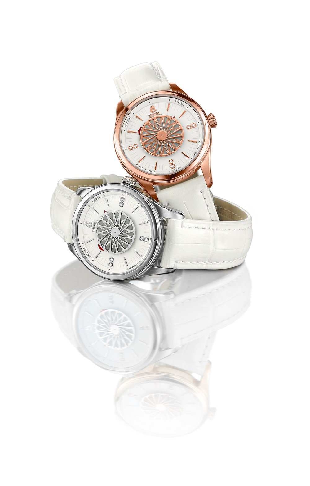 The Cocktail watch fabulously illustrates the creativity behind Ernest Borel with a unique 1940s patented design which the brand has revived to match today’s tastes. Proposed in five colours, it reproduces the fascinating kaleidoscope effect of the original watch with a cutaway disc that rotates as time drifts by. More glamorous than ever with its six diamonds set in the dial, the mesmerising Cocktail watch is perfect when the occasion calls for something especially elegant, and equally at home for more everyday wear.>>>Mechanical automatic, ETA 2671 calibre. Hours, minutes. Steel case with or without pink gold or yellow gold PVD, 31 mm. Patented kaleidoscope dial. Leather strap.