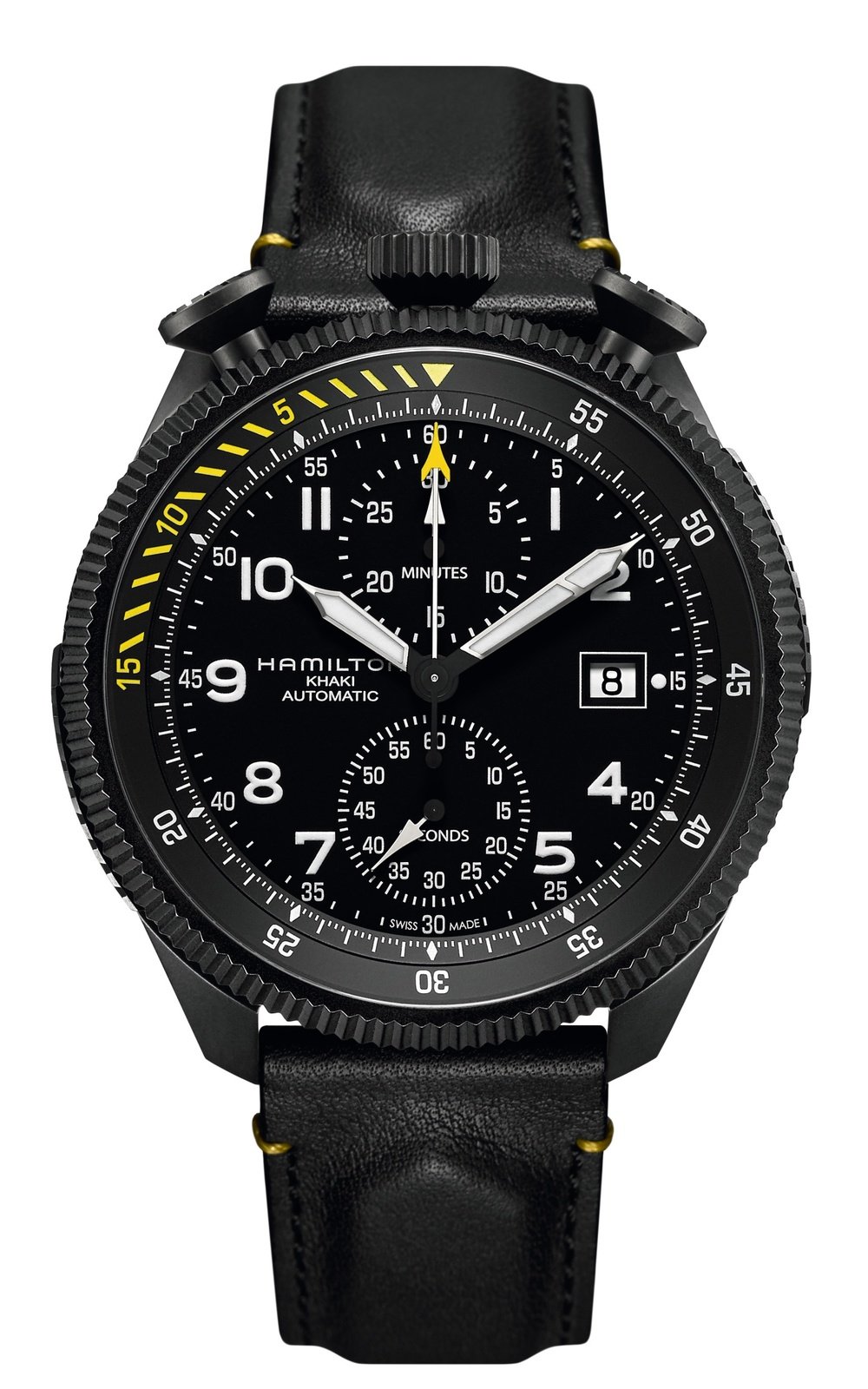 Is this a wristwatch, a desk watch, or designed for the instrument panel of a plane or helicopter? The Khaki Takeoff Auto Chrono is all three. Developed for Air Zermatt, the Swiss helicopter transport and rescue service, the case of this pilot’s watch can be removed from the strap to adapt to every situation, on land and in the air. Incorporating characteristic elements from cockpit instruments right down to the presentation box, features include a rotating flange, which is operated by the bezel, to record countdown times. The technology may be resolutely of today, the inspiration for this watch comes from the chronometer that Hamilton produced during the second world war, then considered to be the most complex aviation timer. Proposed as a 1,999-piece limited and numbered series.>>>Mechanical automatic, calibre H-31 with a typical 60-hour power reserve. Steel case with black PVD, 46.3 mm. Hours, minutes, seconds, date, chronograph, countdown. Removable black leather strap.