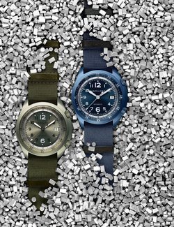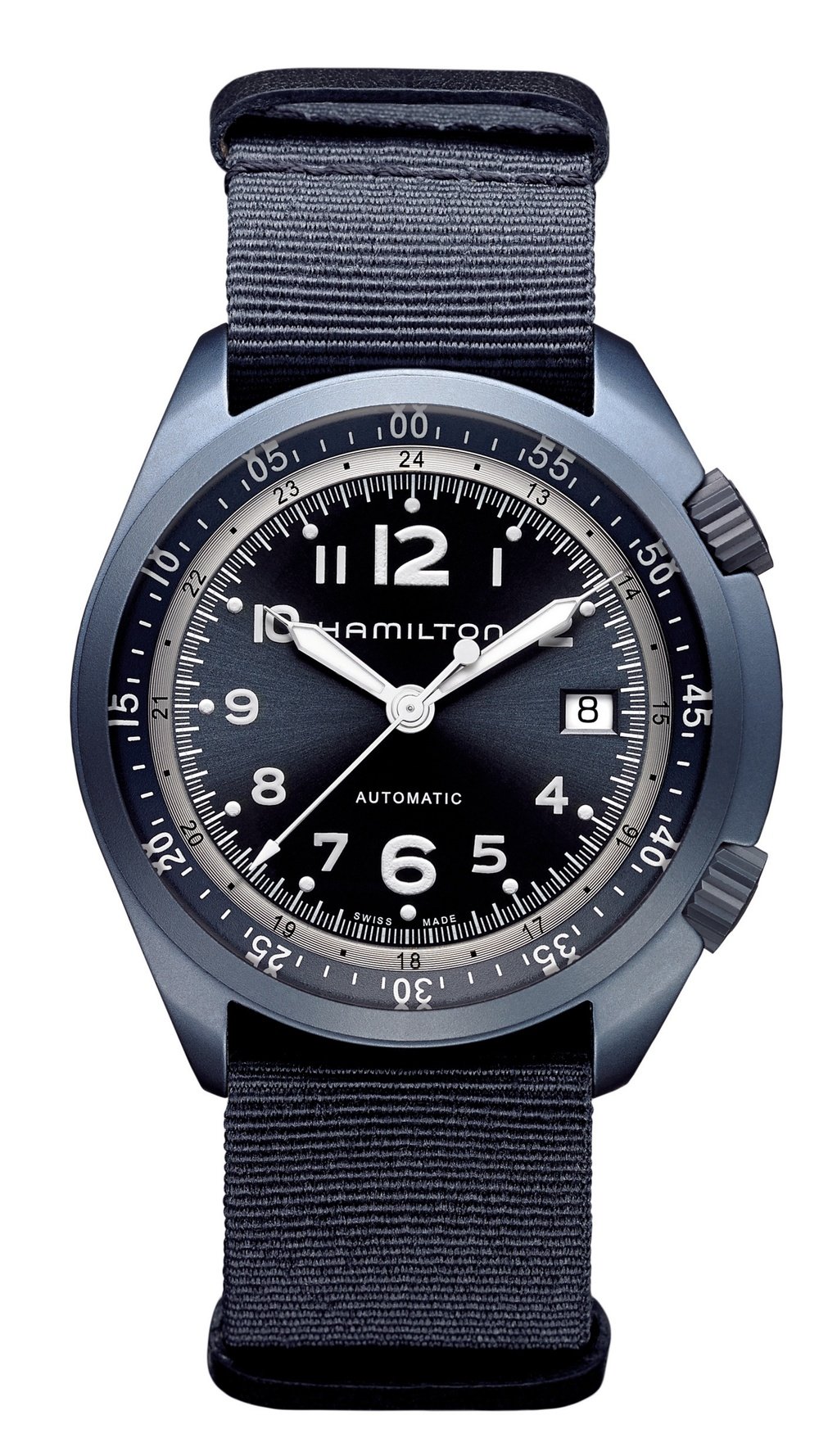 Hamilton draws inspiration from a long history in aviation to produce its first ever watch in aluminium: the Khaki Pilot Pioneer Aluminium. This incredibly lightweight design is modelled on a 1970s watch made for the British Royal Air Force, yet still manages a resolutely contemporary style. The aluminium used for the asymmetric case is coloured blue thanks to a special treatment developed by Hamilton: a reminder, were it needed, of the brand’s pioneering spirit. Every detail of the dial has been carefully studied to suggest a cockpit. A fashionable NATO strap adds the finishing touch.>>>Mechanical automatic, H-10 calibre with a typical 80-hour power reserve. Blue aluminium case, 41 mm. Hours, minutes, seconds, date, countdown. NATO strap. Exists in blue, black, green and sand.