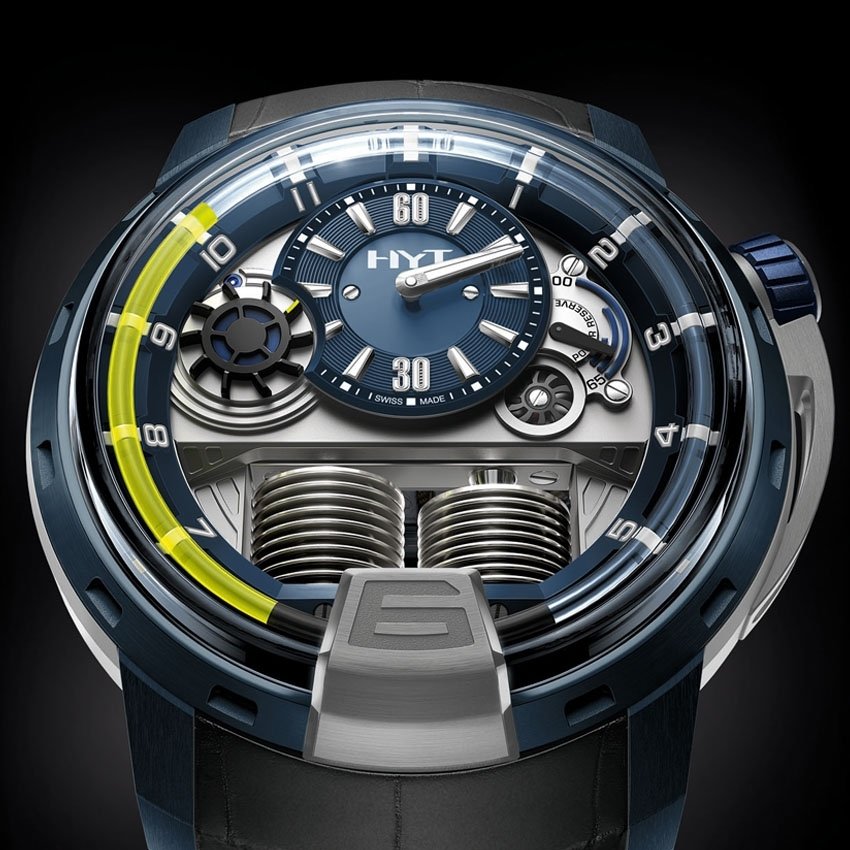 The intrepidness of a pioneer. The force of an adrenaline-charged timepiece. And now the most incredible lightness. The first wristwatch ever to indicate the hour by means of a liquid adopts a new case in an aluminium-rich alloy, ALUN 316B. Meticulously styled down to the last detail, the H1 Alumen Blue coats fluid mechanics in blue to create a striking colour contrast with the bellows and the titanium dome at 6 o’clock. The fluorescent liquid continues to progress along its capillary as time advances to indicate the hour with precision. 50-piece limited series.>>>Hand-wound mechanical movement, exclusive HYT calibre. Retrograde fluid hours, minutes, seconds, power-reserve indicator. ALUN 316B aluminium case, 48.8 mm. Unstructured dial, hours shown by a fluid. Rubberised alligator strap.