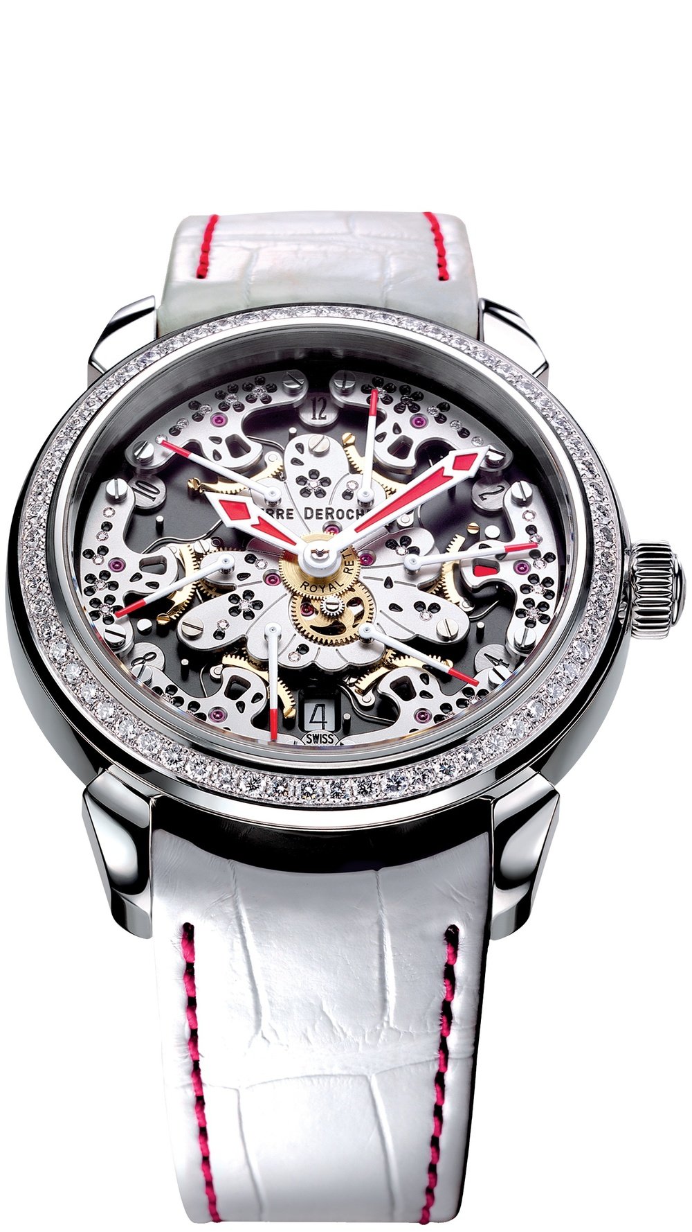 Beneath its ultra-feminine airs, the GrandCliff Milady Royal Retro contains a unique feat of horological mechanics: a fascinating ballet of six seconds hands, each measuring ten seconds before handing over to the next. This mechanical choreography is played out against a backdrop of flowers formed by the delicately sculpted and diamond-set bridges. Time becomes poetry and extends an invitation to join the dance.>>>Mechanical automatic movement, exclusive calibre with engraved and diamond-set bridges. Hours, minutes, retrograde seconds, date. Steel case, 42.5 mm. Bezel set with 64 diamonds (1.28 cts). Alligator strap.