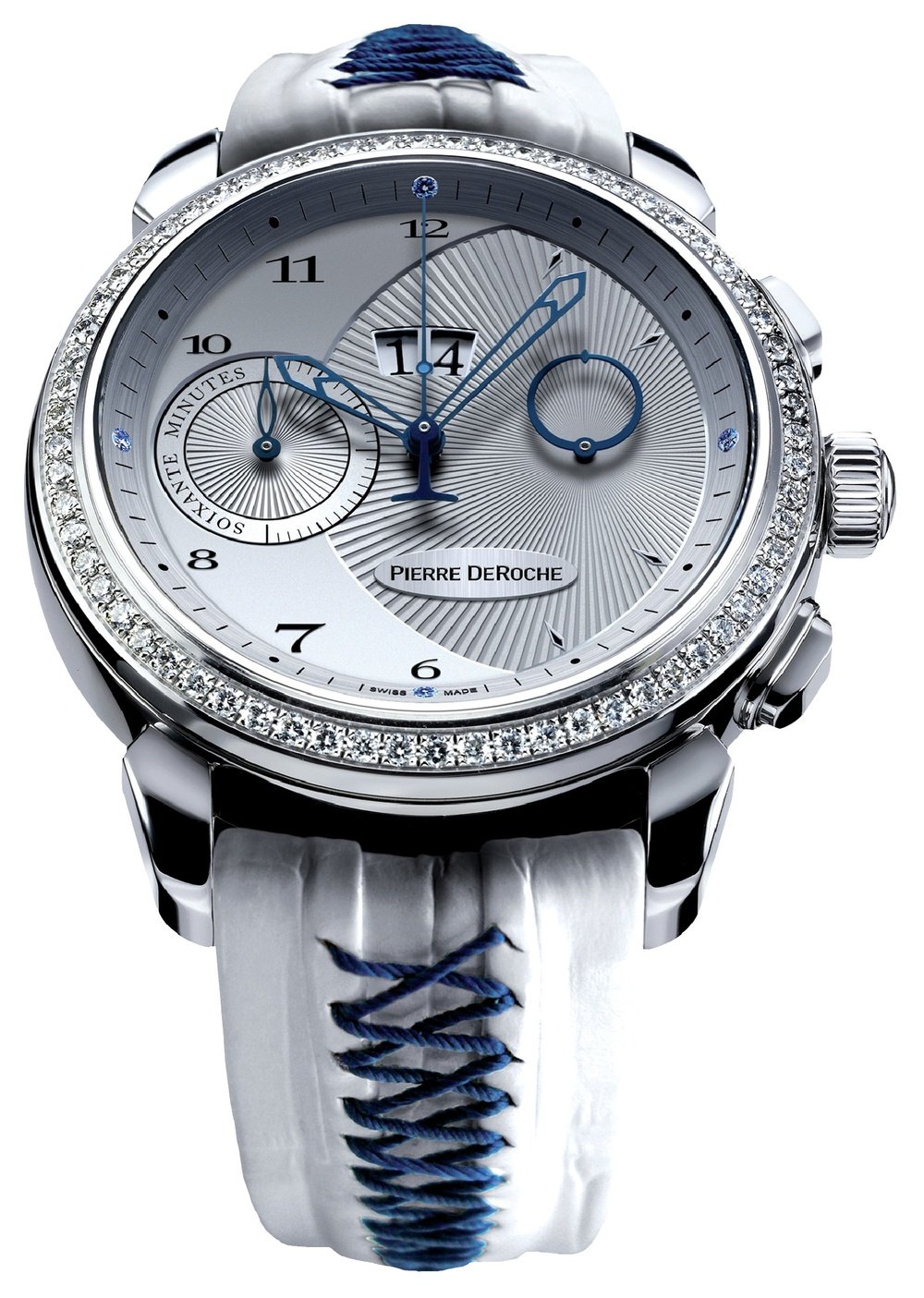 Mechanical watchmaking meets haute couture for this timepiece from Pierre DeRoche. Inside, an automatic movement measures the flight of time, joined by a chronograph and a large date. They come to life within a highly stylised composition that is further accentuated by 64 diamonds, the eternally seductive stone. For a true touch of glamour that will delight fashionistas, an astonishing bodice-inspired strap makes this GrandCliff Milady the ultimate sensual watch.>>>Mechanical automatic movement, exclusive calibre. Steel case, 42.5 mm. Bezel set with 64 diamonds (1.28 cts). Alligator strap with bodice lacing.