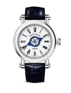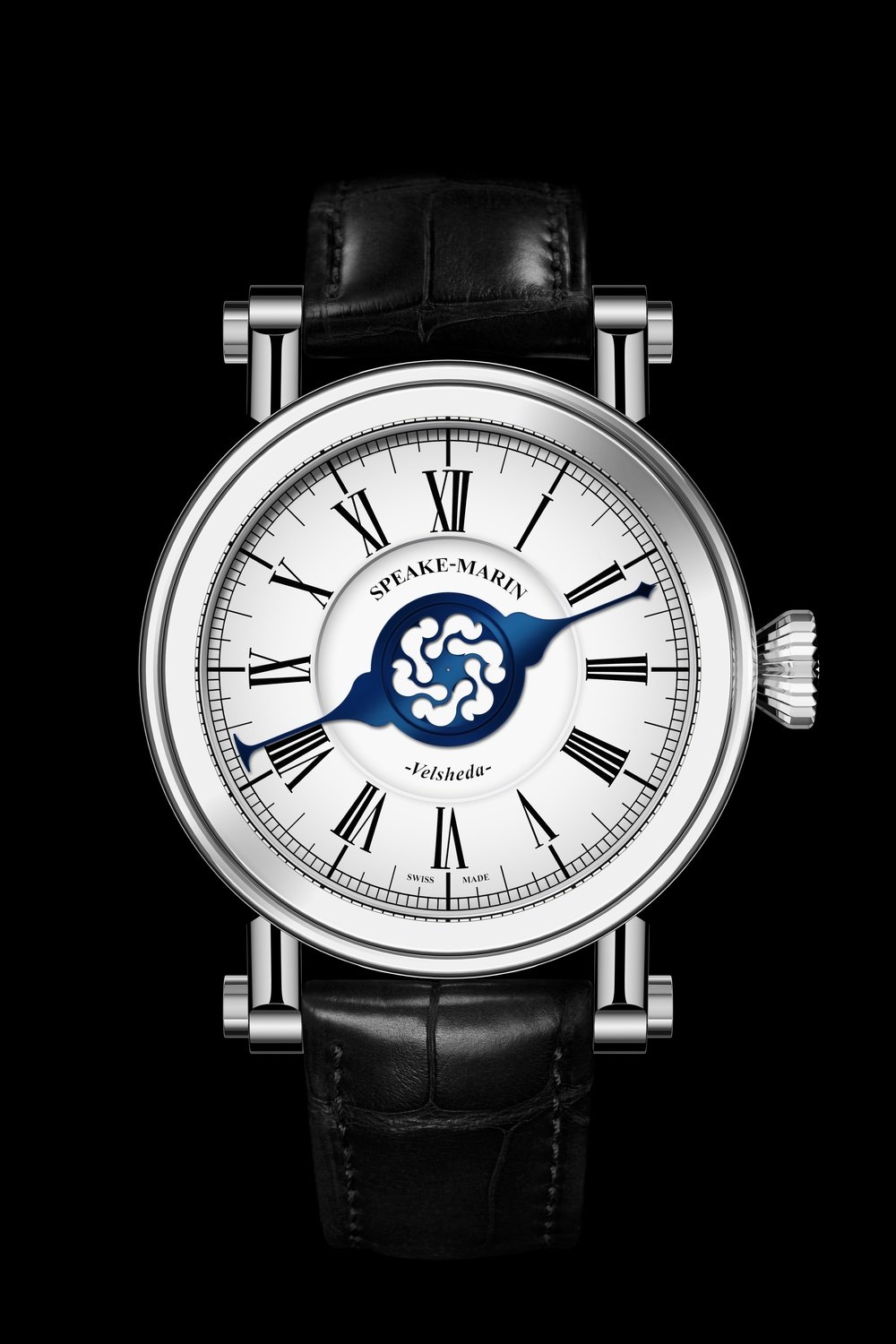 Nautically inspired, the Velsheda watch is named after the iconic British “J Class” yacht, built in the 1930s and still racing today. While the Piccadilly case suggests early marine chronometers, it is the dial that first captures our attention. Featuring a single hand that extends across its entire diameter, it is the backdrop for the fascinating optical effect of two superimposed topping tool motifs, the Speake-Marin logo, rotating at different speeds. Fine, five-minute graduations around the peripheral chapter ring emphasise the watch’s marine compass aesthetic… an invitation to take to the seas.>>>Mechanical automatic, Eros calibre. Hours. Piccadilly case in polished steel, 42 mm. White lacquered dial, single hand with a pointer at one end and an arc at the other. Alligator strap.