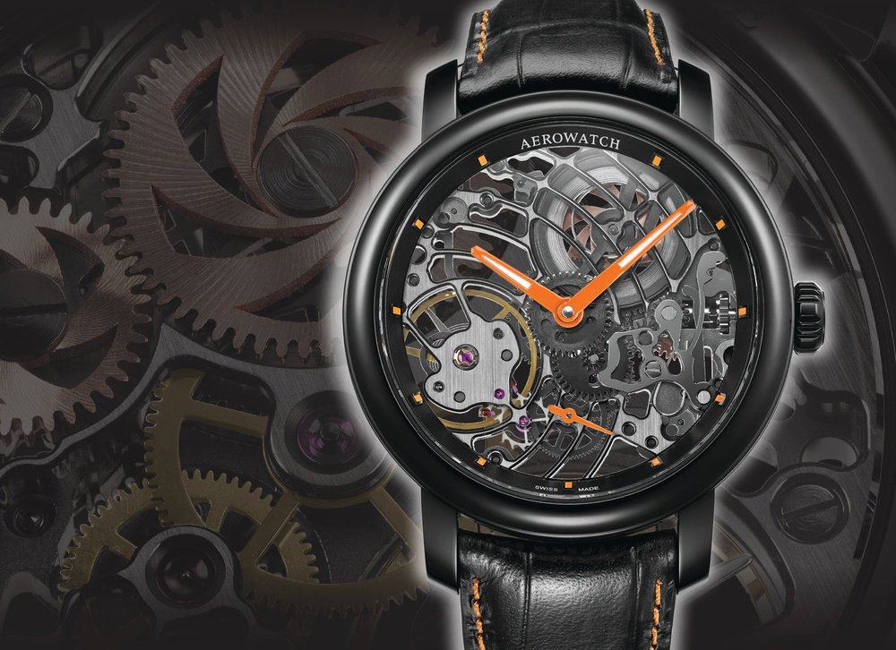 Sophisticated and ultra-contemporary, albeit with a timeless touch drawing upon the values of traditional horology, the new Renaissance Orange Torando radiates genuine visual power. Its generous black-coated case frames a skeleton-worked movement developed and assembled in the Aerowatch workshops. Forming a resolutely graphic composition, this slender mechanism affords a view of the fascinating coiling of the barrel-spring and the constant rotation of the various interacting wheels and pinions. The orange-clad hands and hour-markers create dynamic contrasts with the overall all-black look, while ensuring perfect readability.