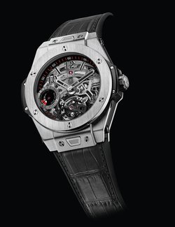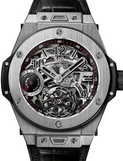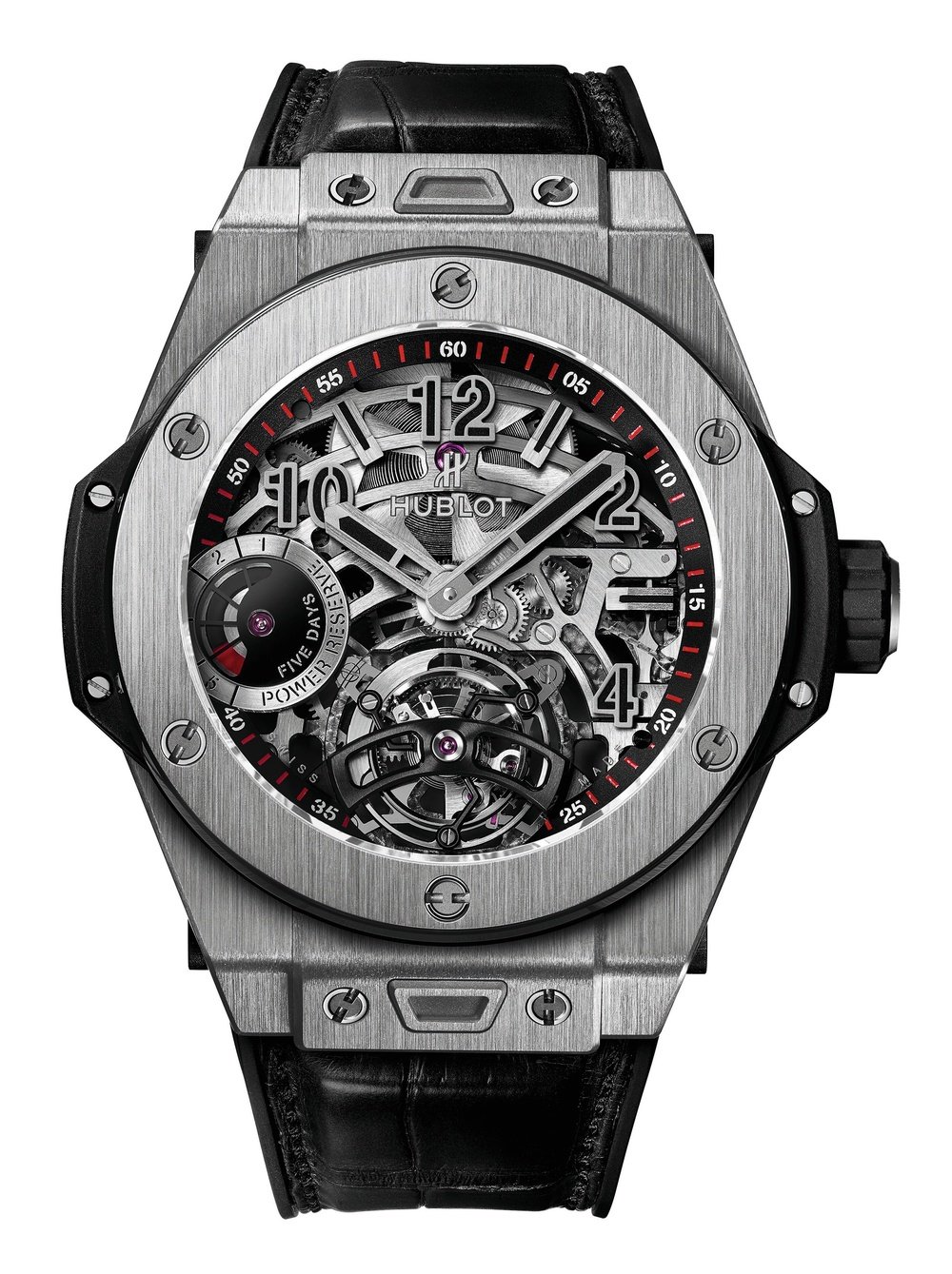 More horology, more expertise, more innovation, more fusion: Hublot rises to the challenge and presents the first tourbillon in the new-generation Big Bang line, featuring a skeleton movement-a feast for the eyes-and the added practicality of a power-reserve indicator on the dial side. Designed, developed and produced entirely by Hublot, this mechanical calibre further confirms the brand as one of the very few watchmakers with the capacity to develop and produce its own movements. Remodelled with new bridge and mainplate architecture, this traditional tourbillon is joined by an additional complication, namely a power-reserve indicator. This watch is an exercise in style and a demonstration of Hublot’s fusion of tradition and modernity, striking the perfect balance between the classicism of the skeleton tourbillon and the dynamic design of the new Big Bang case.