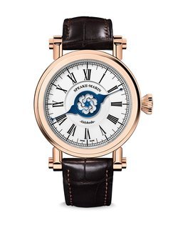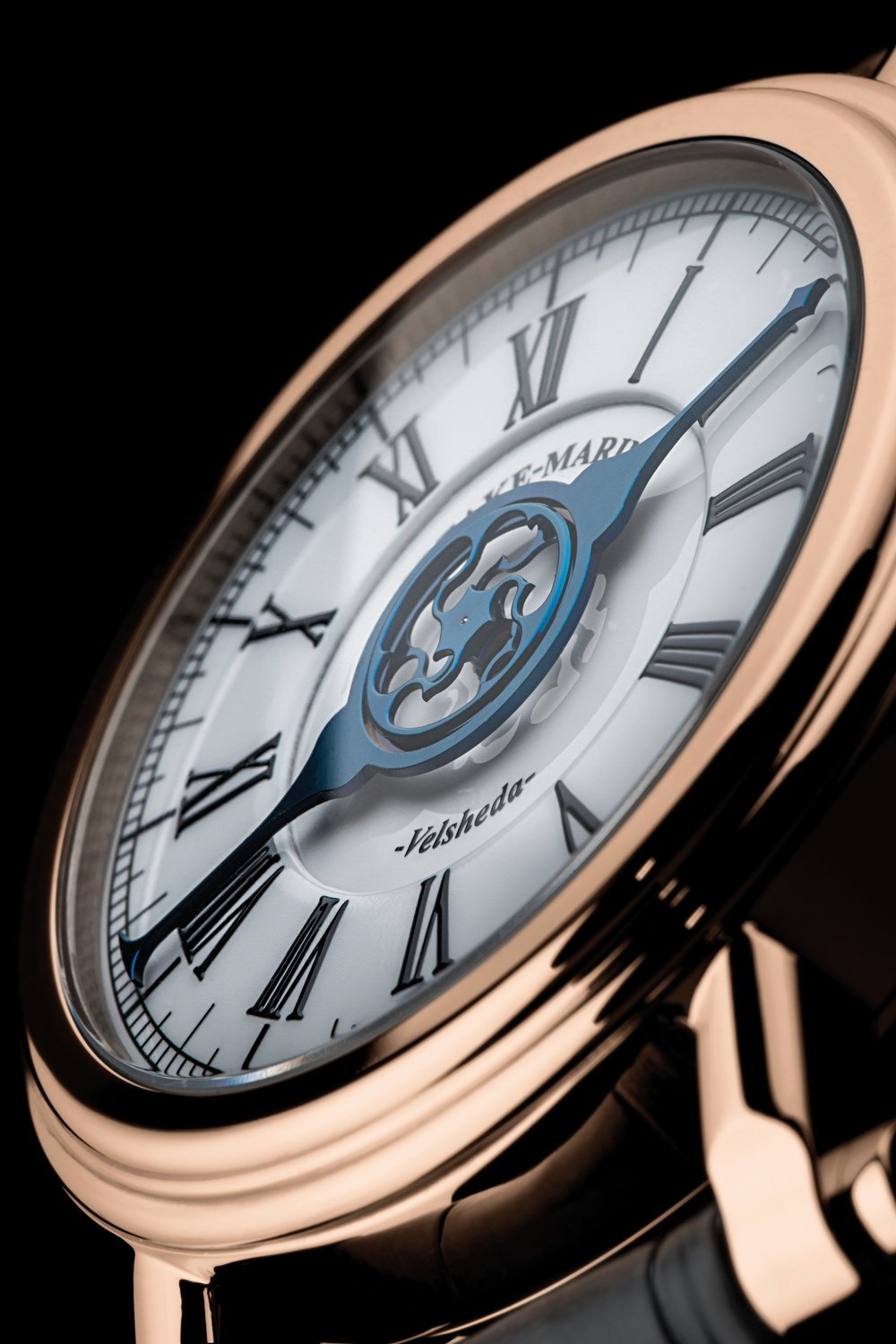 Nautically inspired, the Velsheda watch is named after the “J Class” yacht that was built in the 1930s and is still racing today. While the Piccadilly case suggests early marine chronometers, it is the dial that first captures our attention. Featuring a single blued steel hand that extends across its entire diameter, it is the backdrop for the fascinating optical effect of two superimposed topping tool motifs, the Speake-Marin logo, rotating at different speeds. Counter-balanced at one end by a pointer and at the other by an arc, this hand creates a compass aesthetic that is accentuated by the fine, five-minute graduations around the peripheral chapter ring… an invitation to take to the seas.