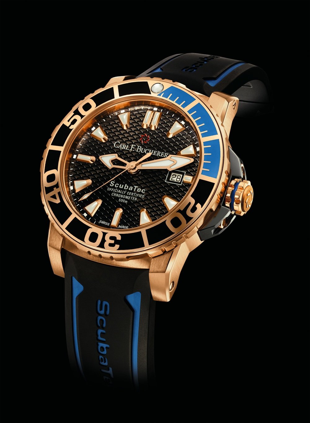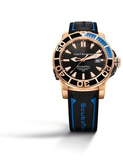 Introduced in 2014, the Patravi ScubaTec returns in a new execution that matches the functional design of a dive watch with the glimmer of pink gold for the case. A focal point of this uniquely seductive timepiece is the blue and black ceramic that circles the bezel. The dial, meanwhile, is finished with a pattern of scales that reflect the light, much like the shimmer on the surface of the waves. The Patravi ScubaTec is, of course, at home underwater where it makes the perfect diving buddy for deep-sea exploration, thanks to its 500-metre water resistance. The chronometer-certified movement tracks time with constant precision and reliability while the helium valve automatically depressurises to prevent damage to the case. The unidirectional rotating bezel guarantees optimal security even if the bezel is accidentally knocked. Luminescent hour-markers remain perfectly legible even in murky underwater conditions. The sturdy rubber strap can be adjusted to wear over a diving suit.