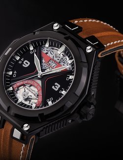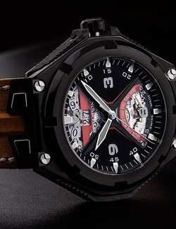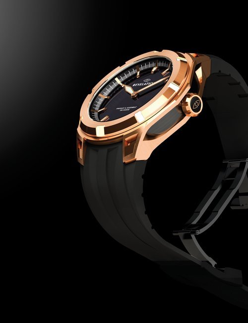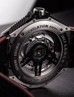 More innovative and masculine than ever, the new R07 Legend Magical Watch Dial® inaugurates the Grand Sport line by Revelation by asserting its distinctive identity codes through an extreme interpretation of the fundamental brand concept: the Revelation System®. A simple 90° turn of the bezel transforms the dial to reveal large date and retrograde day displays. This second face is revealed in an original manner by means of mechanical elements cut out and staged in a graphic and colourful way. The innovative and adrenalin-packed case of the R07 Legend Magical Watch Dial® is designed to associate various materials and structures with high-tech accents. The strap has also evolved so that the edges can be rolled in order to play with the inside materials thus attractively featured along the side. The DNA of Revelation has been carefully preserved, including the special lug with the brand’s emblematic studs.