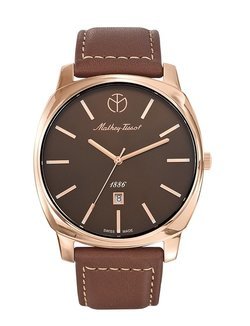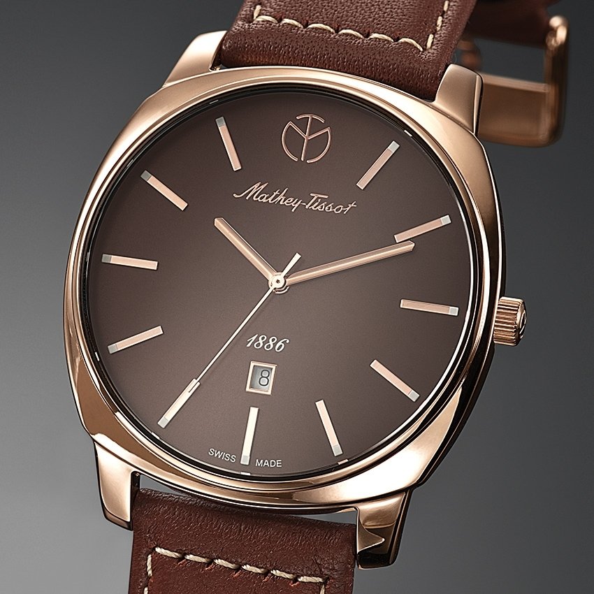 In 1886, the first watches to bear the Mathey-Tissot name left the tranquil village of Les Ponts-de-Martel in the Swiss Jura mountains and set out to win over admirers of finely crafted timepieces around the world. Smart, the latest piece from the Mathey-Tissot ateliers, which are now located in the canton of Ticino, carries on this tradition. The elegant cushion-shaped case with its pink gold-plating exudes classic style tinged with modernity while the dial, in a chocolate-brown hue, eschews excess. The elongated hour-markers add a note of subdued elegance while ensuring time can be read at a glance. The date is shown in a window at 6 o’clock. A leather strap completes the whole while bringing a touch of ultimate refinement to this skilfully composed harmony of gold and chocolate shades.
