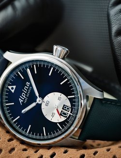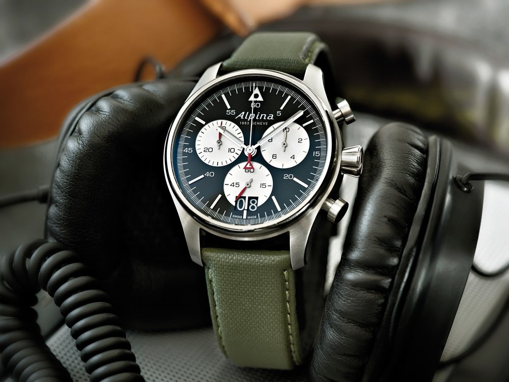 Well accustomed to the art of developing high-performance professional aviation watches, Alpina is enriching its emblematic Startimer Pilot collection with a new chronograph featuring a large date display. Its black dial is inspired by the 1970s Alpina aviator watches, displaying impeccable legibility thanks to the contrasting effect created by the silver-toned counters. While the hour and minute hands are enhanced with white Superluminova, the chronograph seconds hands bears the classic Alpina signature: a red triangle at its base. The sturdy steel case houses the high-precision AL-372 quartz movement serving to power all the chronographs in the Startimer Pilot line. The technical khaki green strap is entirely in tune with the spirit of the watch and this model is also available with a metal bracelet.