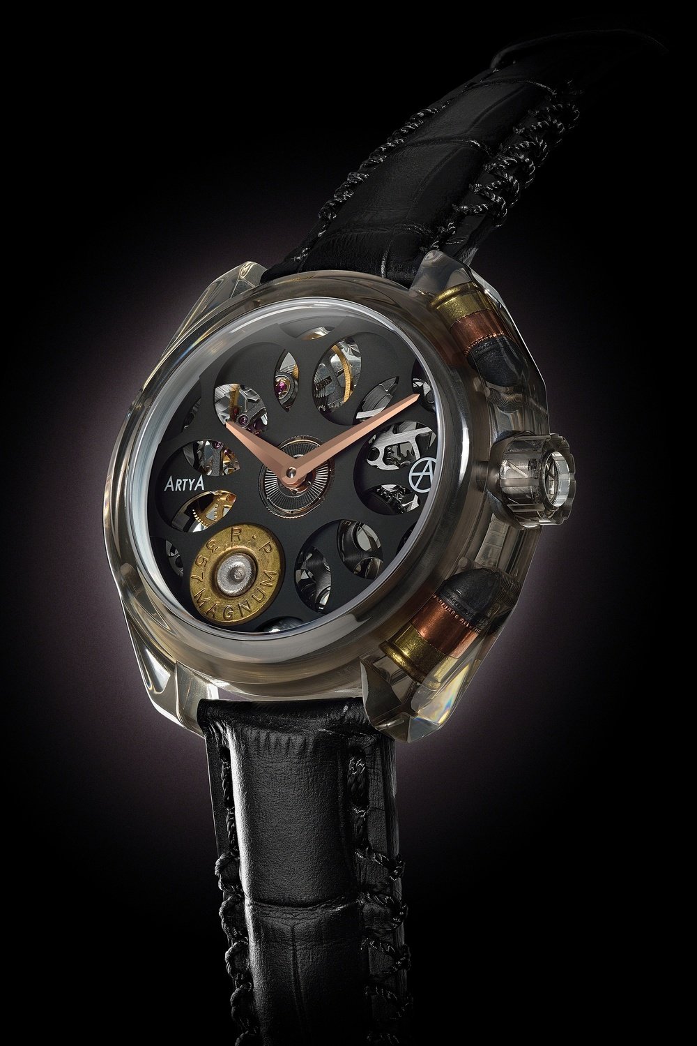 ArtyA takes its Son of a Gun concept to a whole new level: transparency. Serving as a sobering reminder that our time on earth is short, two genuine Flobert 6 mm bullets are fitted to the side of the case, right against the wrist. Suspended and motionless, as if neutralised in mid-air, they are inoffensive even though they have not been fired. The longstanding dream of designer Yvan Arpa has now come true thanks to a new technology: itr²®, standing for Innovation, Technical, Resin and Revolutionary. This composite material charged with carbon nanotubes is four times lighter than titanium. Transparency is in fact an integral of the entire design of the Glasnost G1, since its movement is entirely skeletonised to allow light to shine through its gear wheels, visible through both the sapphire crystal caseback and the iconic dial structured like the barrel of a revolver. Spinning with each move of the wrist, the latter houses a real bullet evoking the fact that life is a game of Russian roulette.