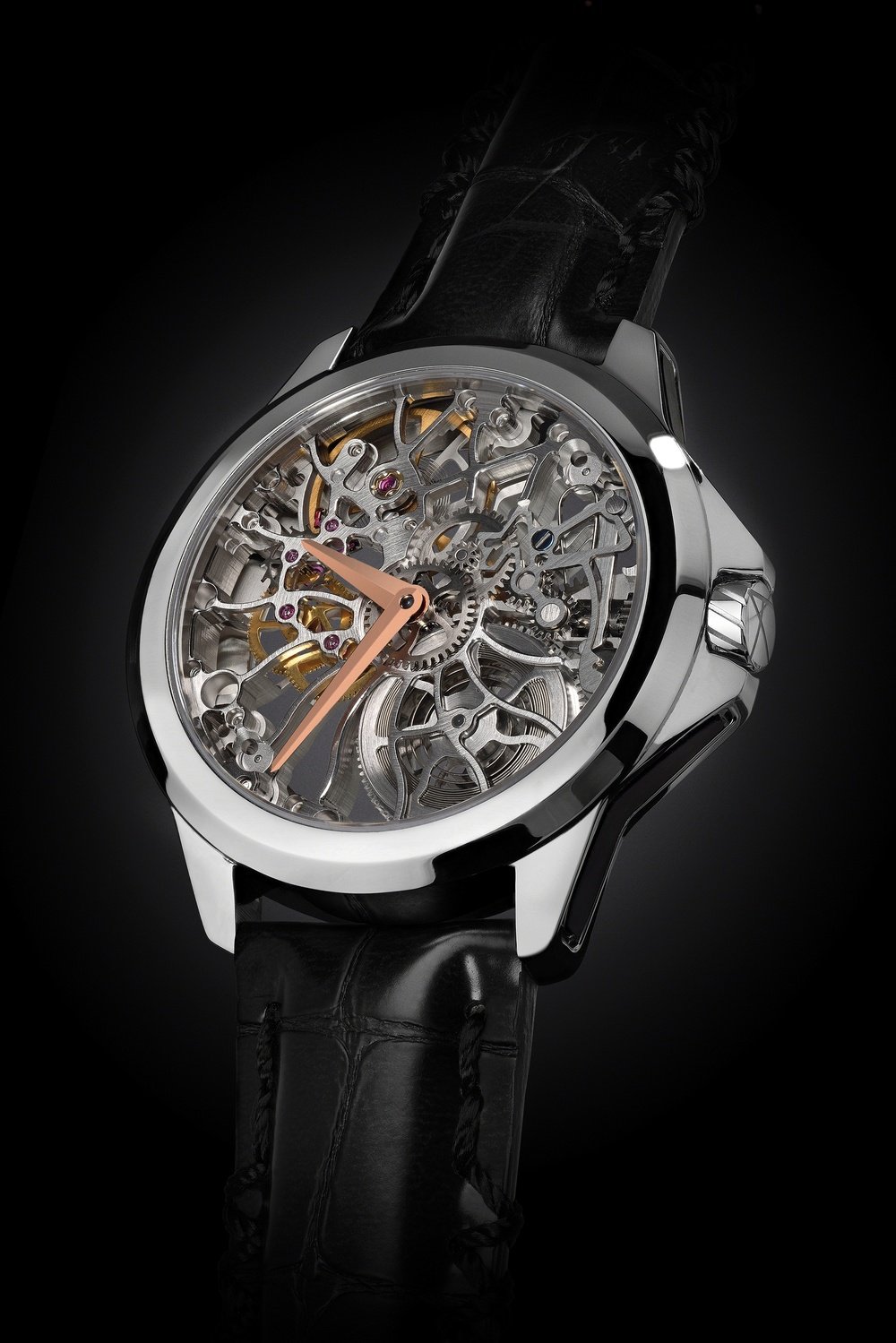 Skeletonisation is a difficult art when it comes to watchmaking. Whether modern or classic, the architecture of the movement thus pared down to essentials must be aesthetically pleasing and not impede reading the time. Artya successfully ventures into this field with this collection named “Shams”, the Arabic word for the sun. It is easy to see why when examining the original cut-out of this hand-wound movement. While the shape remains the same for the three variations of this collection (each issued in a 99-piece limited edition), they appear clothed in original exteriors according to the various PVD treatments applied. The steel case/black movement is accompanied by a version with steel case and 100% gold-toned movement, along with another sports a steel case and steel movement. This variety will appeal to both men and women across all generations.