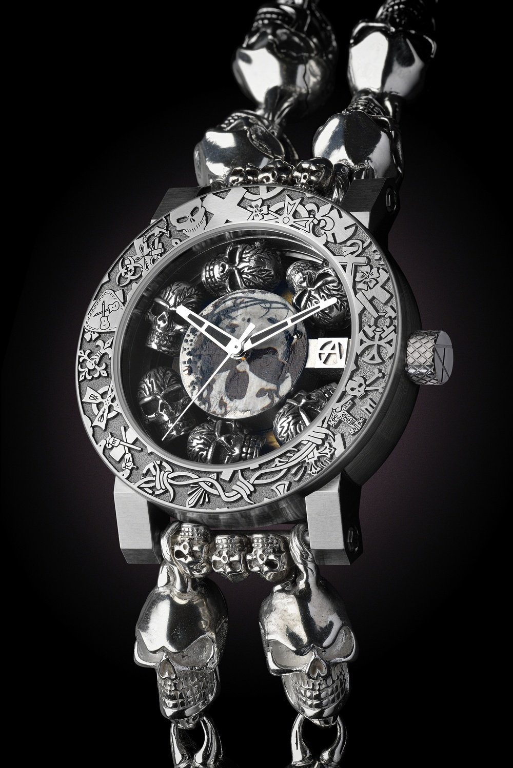 As always, the independent ArtyA brand never does things in half measures. Having popularised the skull in the watchmaking world, it now delivers an extreme interpretation of this motif with its Skulls & Bones model. The entirely hand-sculpted skulls stud the entire watch from dial through case to bracelet. Designer Yvan Arpa gives new meaning to this symbol by infusing it with an artistic dimension. A first skull appears in the centre of the dial, with six other hand-sculpted skulls performing a macabre dance around it. Carved into the steel Bezel, a serie of bones, crosses, totems, guitars and pistols echo the skulls on the bezel, echoing the 3D effect. The massive, deliberately provocative bracelet shatters any conventions and takes the Skulls & Bones into an unprecedented creative dimension, since there can on longer be any talk of a watch and its bracelet. The model IS its bracelet and the bracelet IS the model.