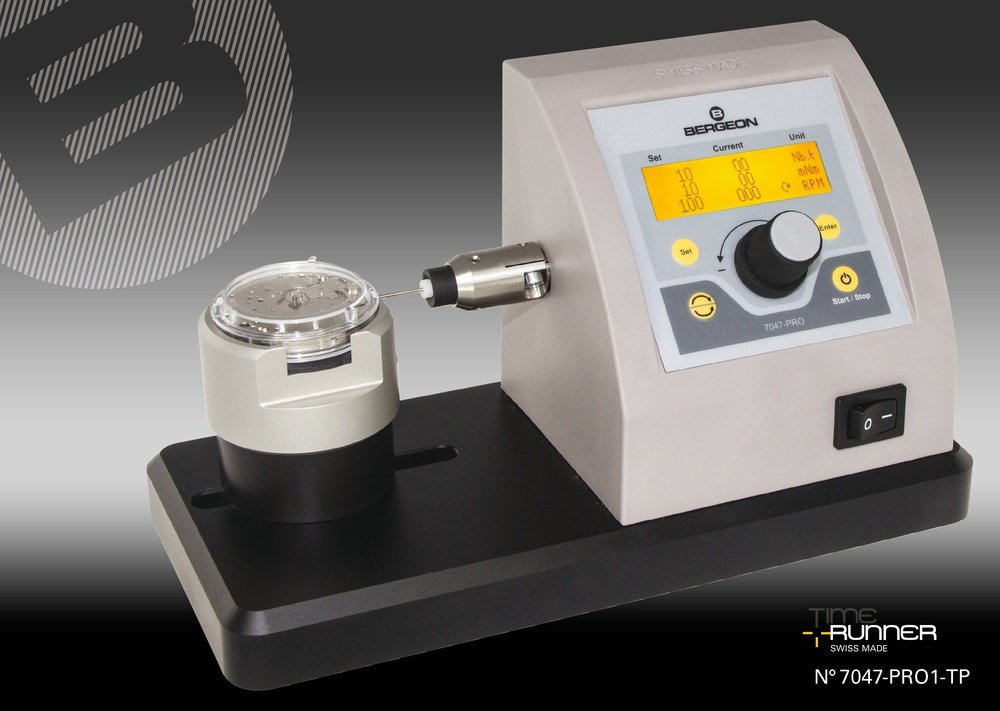 Bergeon presents its new Time Runner machine for winding hand-wound and automatic mechanical watches. It serves to control winding, date-setting and time-setting functions via the crown, both on movements with working factory stems and on completed watches. The machine can be easily configured via a central button and results are read off on a broad LCD screen. The table that may be adjusted both laterally and vertically ensures excellent stability. Both the machine and its table are Swiss Made.