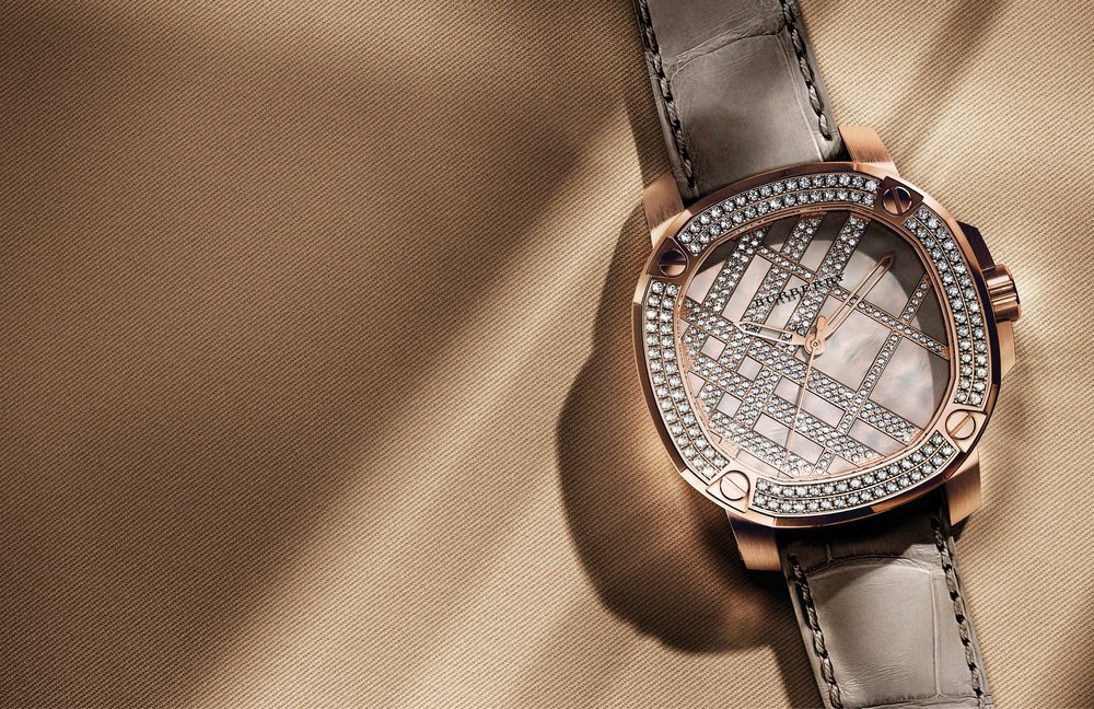 The iconic “Check” motif lining Burberry trench coats finds a new gold and diamond interpretation designed by Christopher Bailey, Chief Creative Officer and CEO of the British brand. A model made exclusively to order, The Britain Icon Check for Women reproduces this motif in a precious woven pattern hand-set on a mother-of-pearl dial. The diamonds magnify this design created in the 1920s, accentuated by the stones incrusted in double rows on the bezel. Entirely crafted in Switzerland, this exceptional model also embodies traditional watchmaking expertise with the brand-new automatic STP3-13 swan’s neck movement beating at its heart.