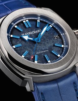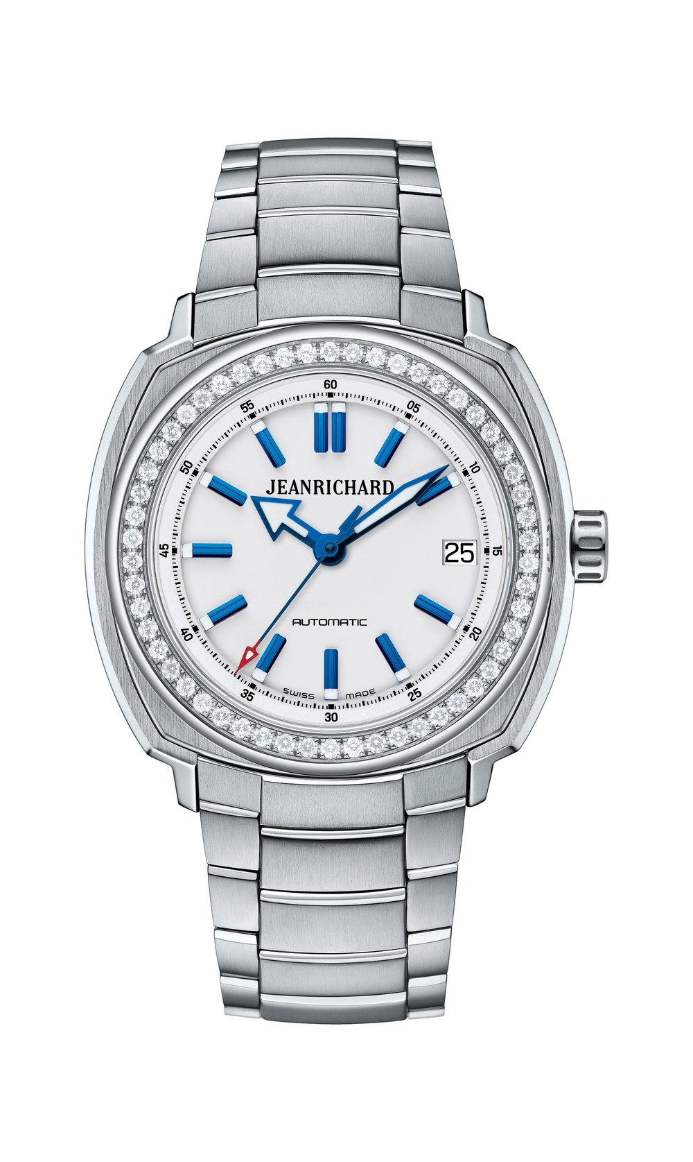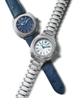Inspiration comes out of the blue for Jeanrichard, whose iconic Terrascope lends itself to two original iterations in a new 39 mm size. The first opts for the laidback, stylish colour of denim with a structured blue dial and a matching ostrich strap. The second stands out for its blue hour-markers which are suspended above a matt white dial. Diamonds embellish the bezel in steel, a metal echoed in the bracelet. In true Terrascope style, these new versions boast the legendary case which encloses a round opening in a cushion shape, all the while playing on subtle contrasts between a vertical brushed finish and a polished finish. Sporting and elegant, both these watches are devoted to a life lived for adventure, discovery and the urge to always go that little bit further.