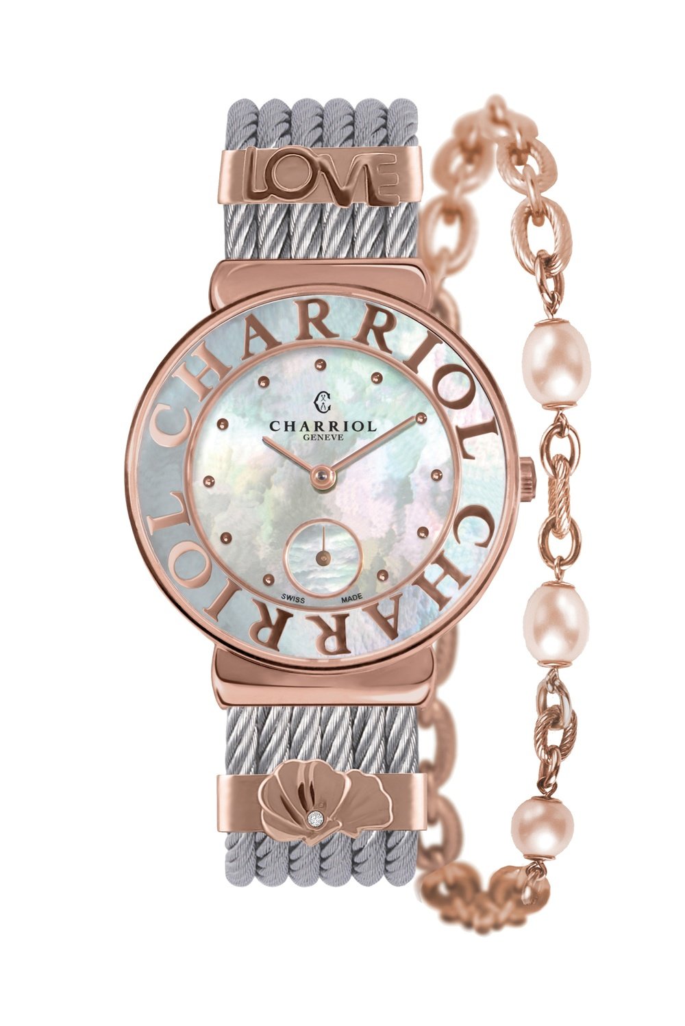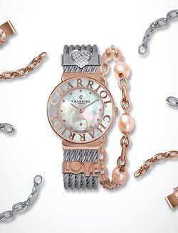 The new St-Tropez™ Style creation from Charriol has what it takes to spark an instant and deep-felt crush. It single-handedly captures the glamour and sparkle of the famous city on the Côte d’Azur. Not only are the dial and bezel adorned in mother-of-pearl, but this model also adapts to every desire thanks to interchangeable clips and chains. The latter are in turn adorned with white zircons, a gem-set double heart, white freshwater pearls and a wealth of other possibilities expressing exquisite wristworn femininity. The watch also comes with decorative clips that can be easily fitted on the legendary cable bracelet. No less than six different motifs are offered to further convey the mood of the moment. Intensely personal and openly romantic, St-Tropez™ Style pays tribute to the inexhaustible strength of love, beauty and serenity. It is the ultimate expression of a unique and infinitely Charriol style.