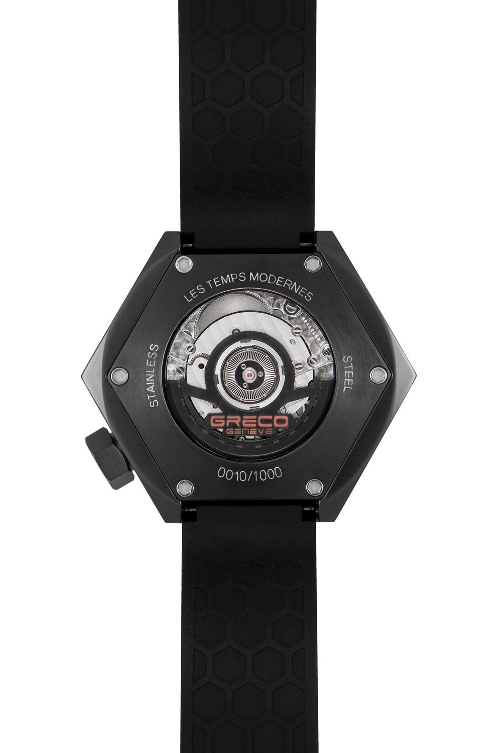 In complete defiance of the adage that “form follows function”, Greco Genève has transformed a truly utilitarian object, the hex nut, into a symbol of modern luxury. Fitting a mechanical movement inside a nut-shaped case, threading included, is nothing short of an exploit, yet the Hexagonal Nut watch is much more than a demonstration of expertise inherited from Swiss watchmaking tradition. The first creation in the Les Temps Modernes collection, it conveys the universal values of one of cinema’s masterpieces: Modern Times. Like the film’s hero, Greco Genève plays around with an icon of the industrialised world, a hex nut, and uses it to propel us into a more optimistic future, where people will be at the heart of industrial aesthetics. Full of humour and totally off-the-wall, this 50-piece limited series shows the hex nut in a new light. Mechanical allusions abound, from the wrench-shaped hands to the silicon strap that resembles the tyre tread of a powerful 4x4.