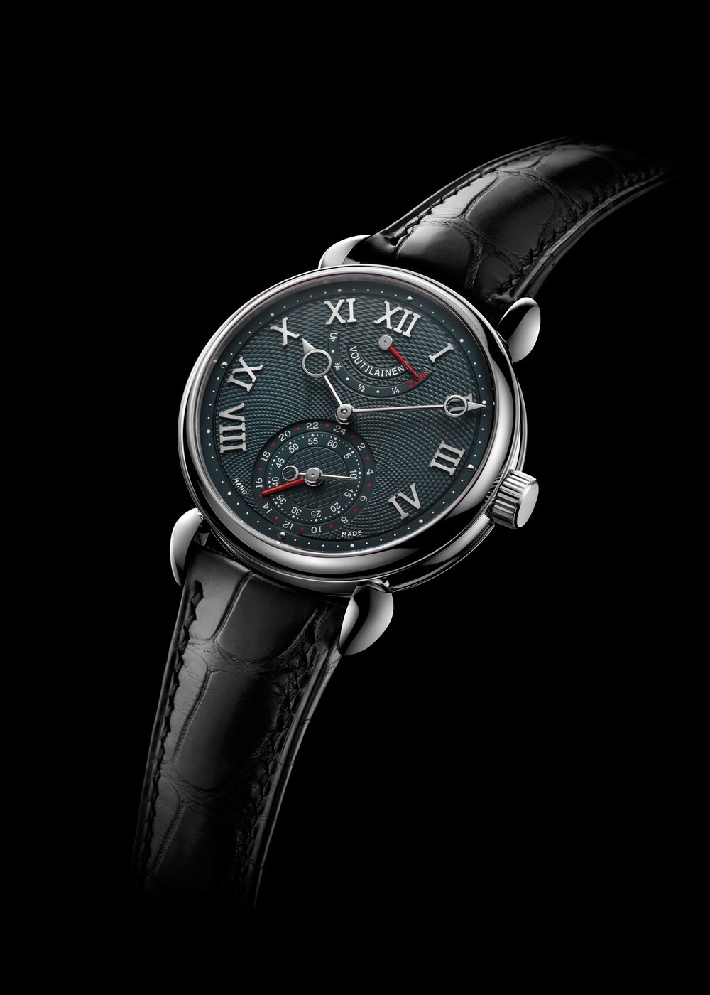 As befits such a virtuoso of complicated timepieces, this new watch by Kari Voutilainen incorporates a second time zone with 24-hour indicator and a retrograde power-reserve indicator. As always, the movement is developed and hand-crafted from start to finish inside the master watchmaker’s workshops, in the peace and tranquillity of the Swiss village of Môtiers. Fashioned from maillechort, this top-flight mechanical movement comprises no fewer than 250 parts and 28 jewels. An ingenious mechanism allows the second time zone to be adjusted by the crown, jumping one hour at each push, rather than turning freely, thus maintaining absolute precision with local time. The movement’s traditional finishes of Côtes de Genève and hand-chamfering can be admired through the sapphire crystal back, while the dial exudes refined elegance. The GMT indication at 6 o’clock embraces the small seconds, mirrored by the retrograde power-reserve indicator at 12 o’clock. 12-piece limited series.