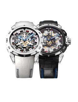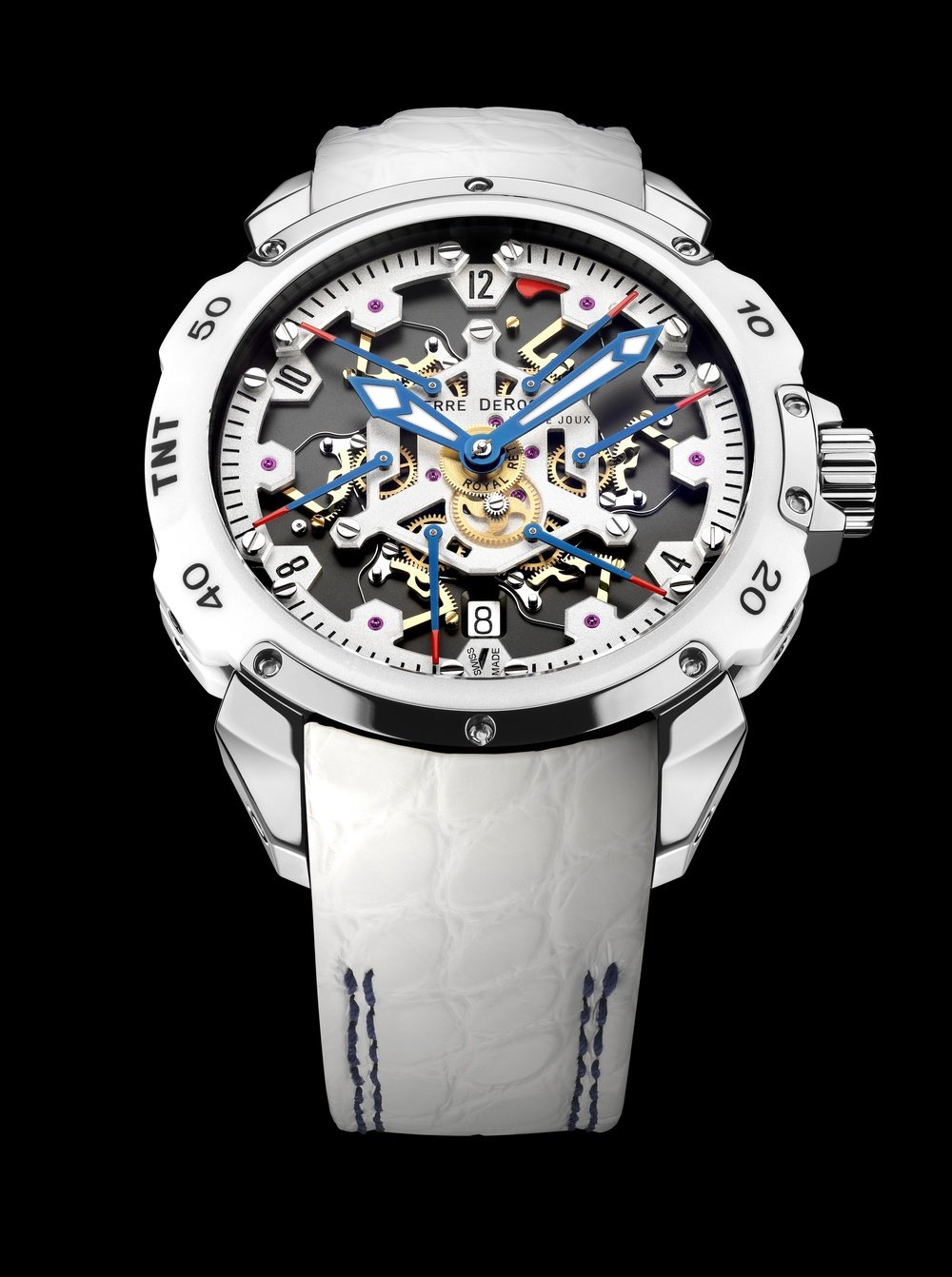 With its perfectly choreographed dance of six retrograde hands, the TNT Royal is an endless source of fascination. Not content with staging a complication that is unique in the world, it now explores the field of futuristic materials by introducing a bezel in itr²®. This totally hypoallergenic composite material is six times lighter than steel and four times lighter than titanium. Created from carbon nanotubes, itr²® is transparent. Once charged with ceramic or carbon particles, it turns white or black as desired. Over and above its excellent technical performances, itr²® provides a unique visual effect, echoed by the six seconds bridges and the central bridge alternately draped in sparkling white by means of a stabilised silver coating, or in black. Limited Edition 2x101 pieces.