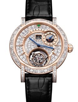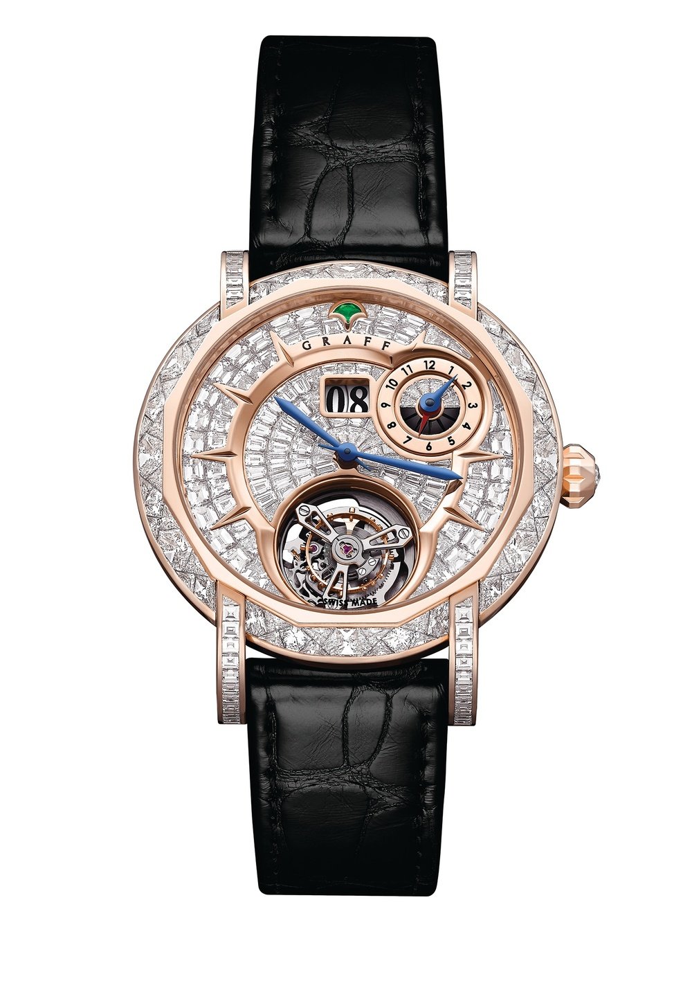 Graff orchestrates a fascinating encounter between Haute Horlogerie and Haute Joaillerie with its new creation: the Diamond MasterGraff Grand Date Dual Time Tourbillon. The result of more than 2,000 hours of development, its mechanical movement associates a flying tourbillon with a dual-time display and a large instantaneous date that jumps at exactly midnight. While the exclusive calibre reveals the beauty of its gear wheels through the sapphire crystal, the case and dial exalt the jewellery-making expertise of the House through a dazzling setting of 329 diamonds totalling 13.7 carats. Set against a backdrop of rose or white gold, the precious stones exercise their timeless powers of fascination and sparkle with radiant fire on a dial also lit up by an emerald at noon, as well as forming the emblematic Graff signature on the dial: an invisibly-set mosaic crafted using an exclusive technique resulting from a full year’s research.