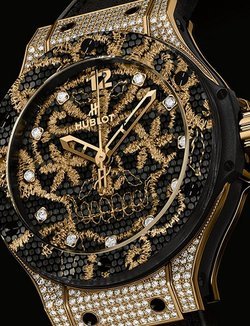 Always true to its principle of fusion, Hublot connects traditional handcrafting with twenty-first-century technology, and takes us on a tour of Swiss savoir-faire, beginning with St. Gallen embroidery. A reference in this age-old art, Bischoff supplies the leading couture houses and luxury lingerie firms. Working with Hublot, Bischoff imagined an exclusive embroidered motif that could fuse with the iconic Big Bang design: a skull on the dial, studded with 11 diamonds, that will appeal to her rebellious side, then flowing arabesques on the bezel and strap. Once embroidered on tulle, they travel from St. Gallen to the Swiss Jura, where they are moulded in carbon fibre, using an exclusive, specially developed process, in order to accentuate the texture. The components are then assembled at the Hublot manufacture in Nyon, where the watch is brought to life by the HUB1110 automatic movement. Each rendition is proposed as a 200-piece limited series.