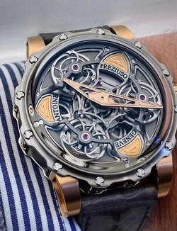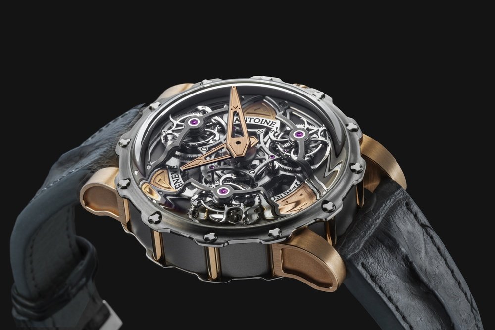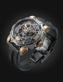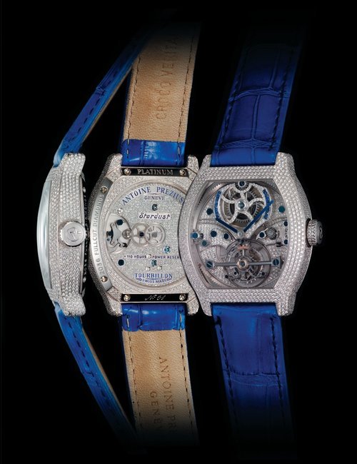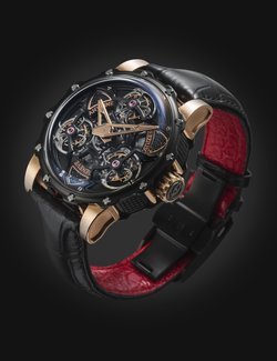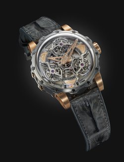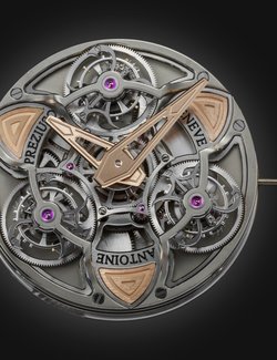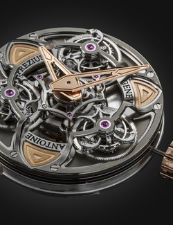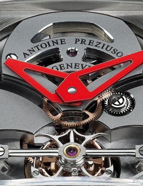 Often considered the supreme horological complication, the tourbillon remains a constant source of fascination. Antoine Preziuso has made it a speciality and now introduces a stunning composition protected by three patents. Working with his son Florian, the independent master-watchmaker has placed three tourbillon carriages on a rotating platform and this association endows the watch with unique precision in all wearing positions. Each of the three tourbillons performs a complete rotation around its axis in one minute, while the entire rotating platform, driven by an original triple planetary differential, requires just 10 minutes to make a complete revolution, with the tourbillons forming a triangle in the centre. A token of ultimate precision, the frequencies of the three regulating organs are attuned to each other by the physical proximity of the tourbillons oscillating at a stable frequency. Limited edition of five for 2015.