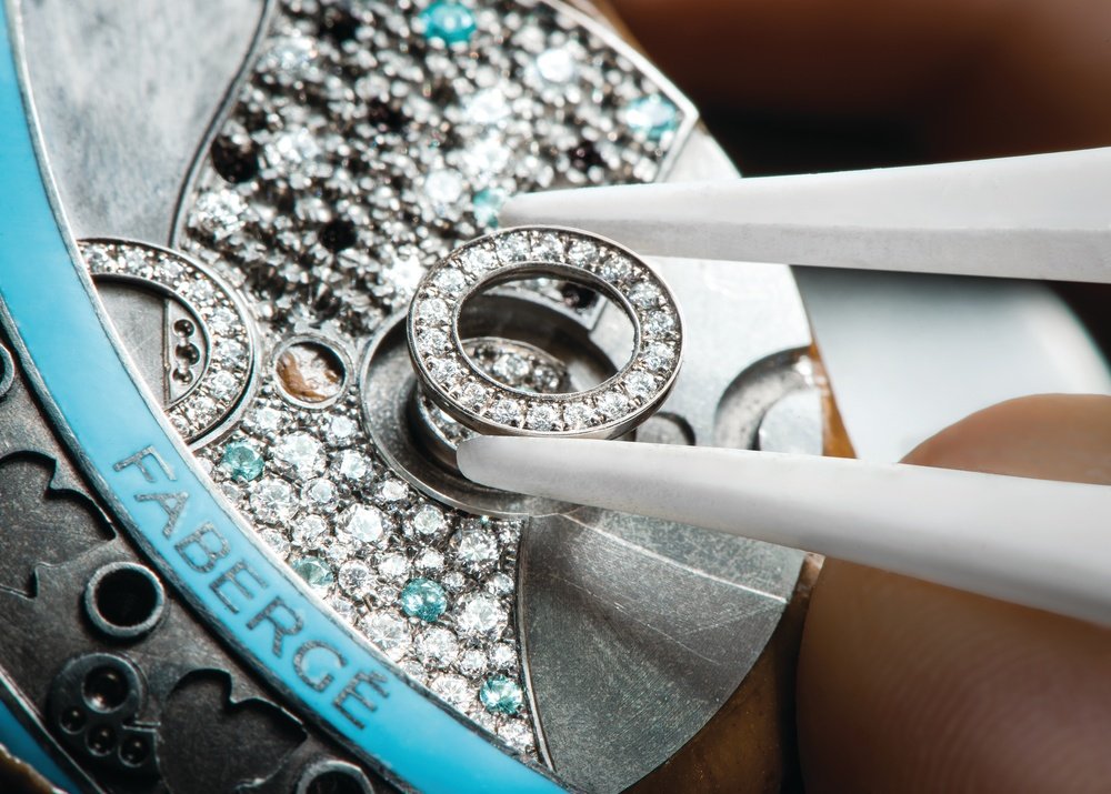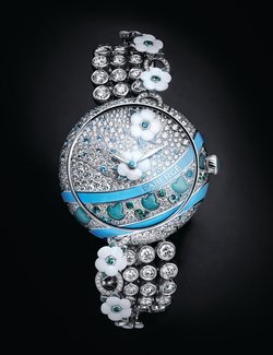The latest creation from the Fabergé ateliers, the Haute Joaillerie Summer in Provence watch was designed like a wreath of flowers woven on a warm afternoon in the south of France. Forming a fascinating interlacing pattern of precious ribbons, diamonds and emeralds mingle with colourful fine stones and dainty flowers individually sculpted in hard stone. Two small supple enamel bands undulate over the creation and stamp it with the Fabergé signature. Others graced with snow-set precious stones wind over the dial to embrace the case. The wrist is gently encircled by a bracelet composed of diamonds set like the beads on a necklace, with a central garland of tiny flowers winding its away along its entire length. A Manufacture-made calibre beats at the heart of this creation, giving life to an exquisitely poetic symphony of colours. Five-piece limited series.