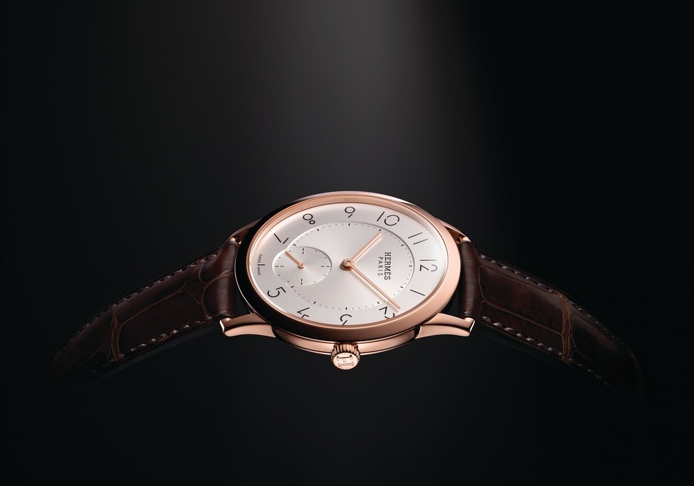 Slim d’Hermès captures the essence of pure form. An elementary sobriety dictates each line, underscored by the thinness of the case and the right angle formed by the lugs. A study in harmony and rigor, Slim d’Hermès draws on the visual culture of Hermès, as witnessed by the original typography of the numerals, designed by Philippe Apeloig. The 39.5 mm diameter watch measures time to the beat of the Hermès H1950 extra-thin Manufacture movement, and can incorporate a perpetual calendar. This automatic calibre integrates a micro-rotor, thus reducing its height to a mere 2.6 millimetres. Versions measuring 32 or 25 mm in diameter are driven by a quartz movement, and crafted in steel or gold, with or without diamonds.