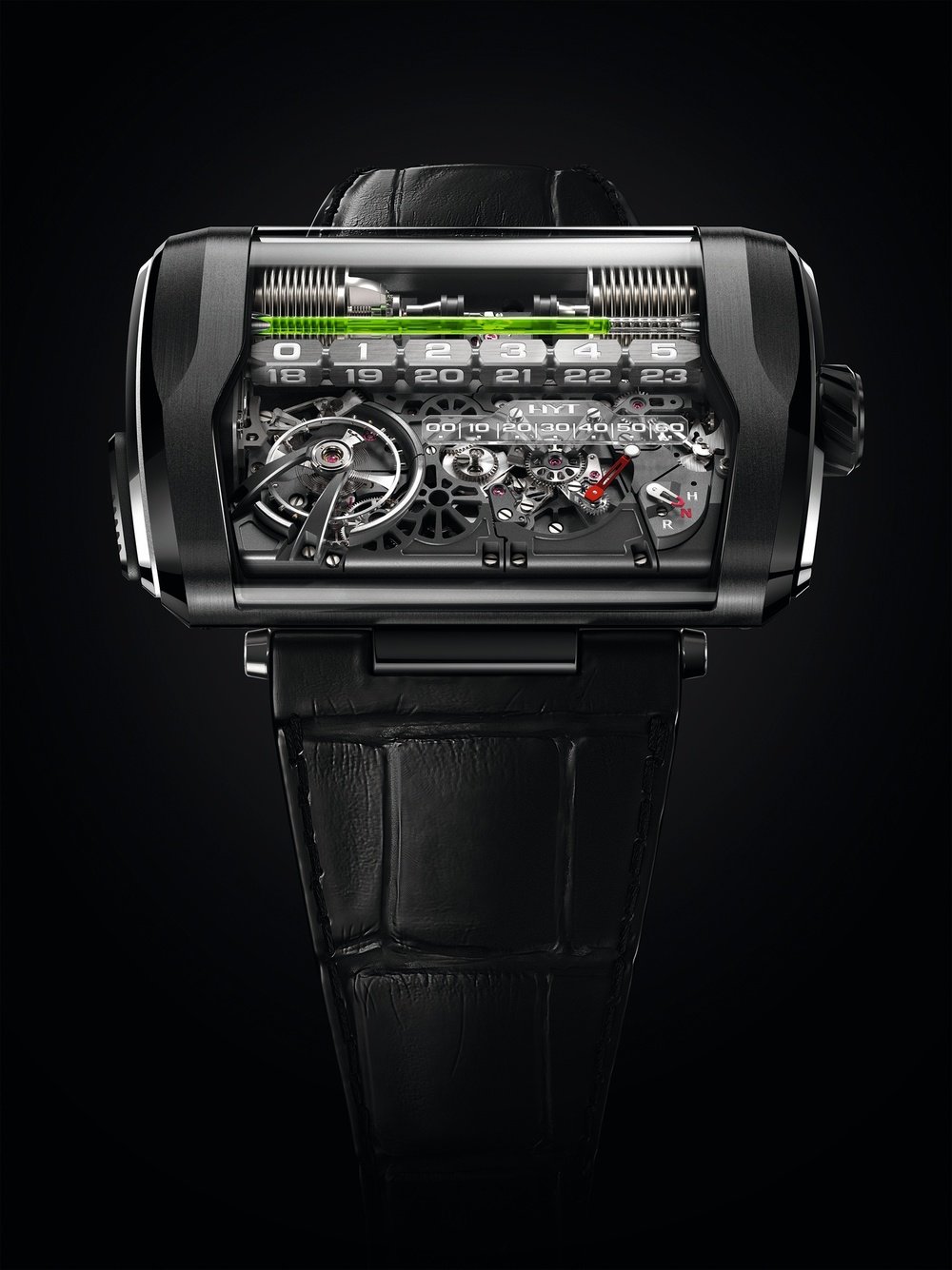 Mechanical hand-wound, exclusive HYT calibre, 53 jewels, 21,600 vib/h, titanium bridges with anthracite PVD treatment, twin barrels, 170-hour power reserve