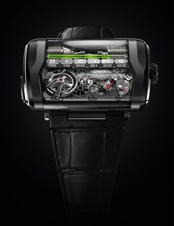 HYT deconstructs time with the H3 then reassembles it around its founding principle of two bellows that inject fluid into a capillary tube that advances with the hours. The H3’s objective is to show hours on a linear display. This was the starting-point for a new movement, developed with Audemars Piguet Renaud & Papi, that ensures the smooth flow of the hours along this linear display. The result is a watch without hands and with no noon. HYT has imagined a rotating, four-sided dial, positioned alongside the hour tube. Each of these sides has six one-hour graduations for a total 24 hours. At the end of each six-hour period, the hour marker makes a retrograde movement during which the dial makes a controlled rotation. Minutes are also counted on a linear display by an articulated, retrograde double arm that sweeps a scale. 25-piece limited series.