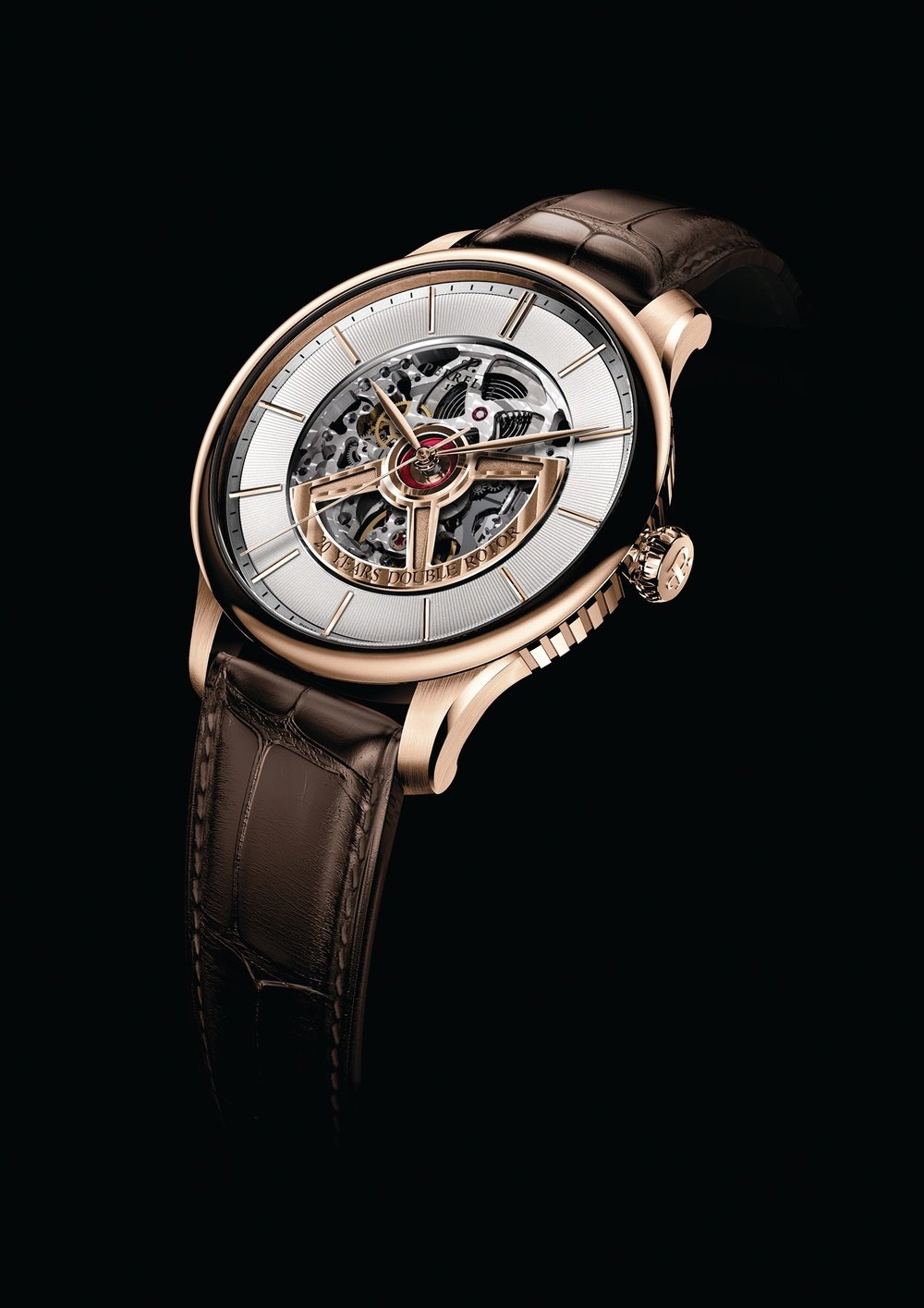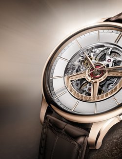 Perrelet celebrates the 20th anniversary of its emblematic Double Rotor by raising this fundamental invention to fresh peaks of refinement. Issued in limited series of 250 for its steel version, and 77 for the pink gold variation, the First Class Double Rotor Skeleton anniversary collection combines the watchmaking genius of this automatic winding system with the art of skeleton-working. Thanks to this ingenious alliance, the openworked dial enables the eye to travel into the heart of the mechanism, lulled by the natural rhythm of the second rotor. The pink gold Double Rotor features a new design with a Côtes de Genève finish and a special engraving to mark this jubilee. Loyal to the original model, the Manufacture Perrelet P-481 calibre has maintained the visible ruby in its centre to give a lively touch to this creation. Embodying a new generation of timepieces, this collection exudes a fascinating creative audacity while remaining firmly attached to the fundamental values of the House of Perrelet.