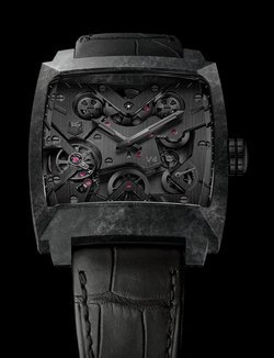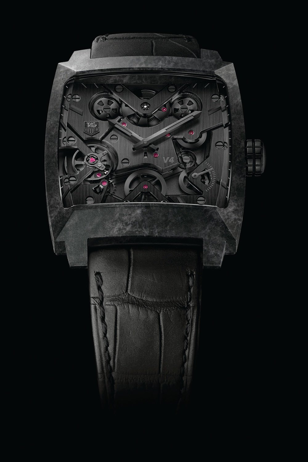 Totally black. Stylish. Uncompromising. Virtually a stealth watch. The Monaco V4 Phantom debuts an innovative case made entirely from Carbon Matrix Composite (CMC), as are the movement’s seven bridges. Using a special technique, the carbon fibres are positioned in the required direction in the mould, then microblasted to produce a particularly stylish “matt black vertical brushed” effect. This command of futuristic materials echoes the avant-garde construction of the famous V4 movement, with micro-belts cut with microscopic teeth and a linear mass which, rather than rotating, runs along a straight track on ball bearings. The dial, which plays on different intensities of black with touches of colour from the jewels, adds to the watch’s sharp design. TAG Heuer is renowned for its innovative spirit and savoir-faire, and this watch has both.